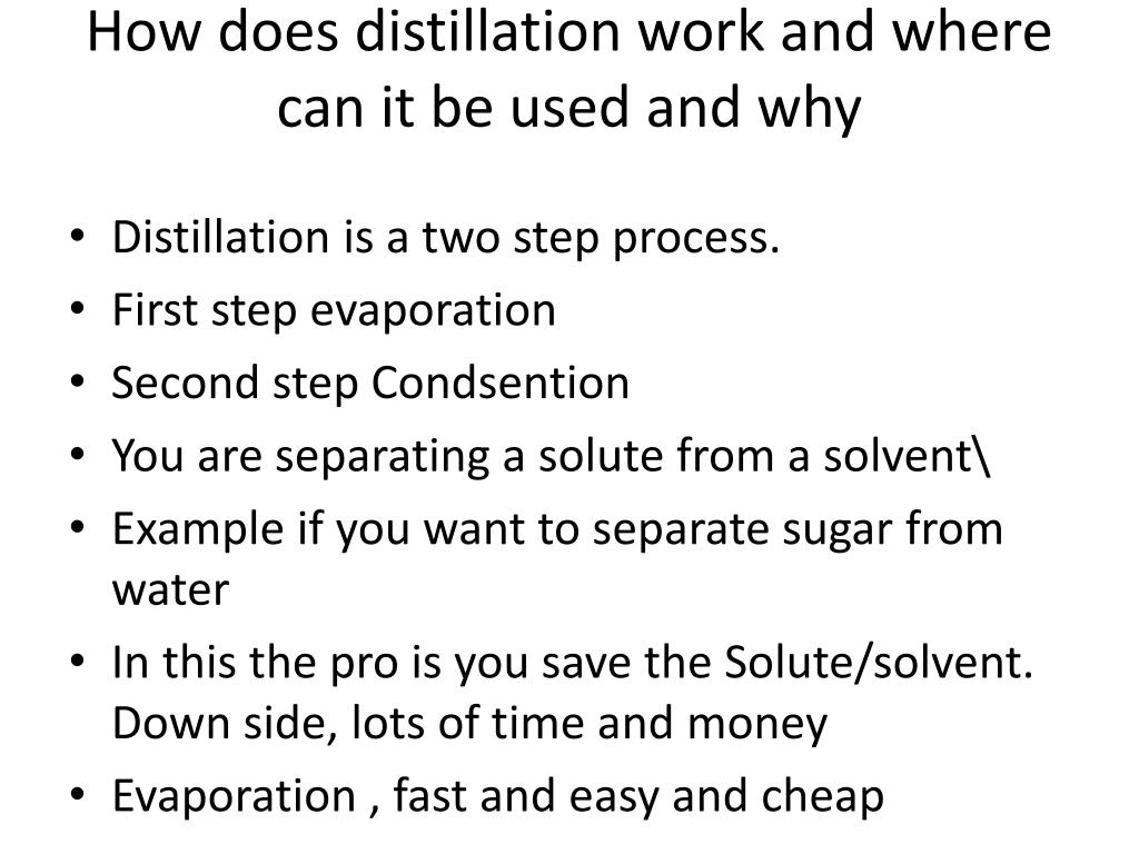 How does distillation work and where can it be used and why • Distillation is a two step process. • First step evaporation • Second step Condsention • You are separating a solute from a solvent\ • Example if you want to separate sugar from water • In this the pro is you save the Solute/solvent. Down side, lots of time and money • Evaporation , fast and easy and cheap