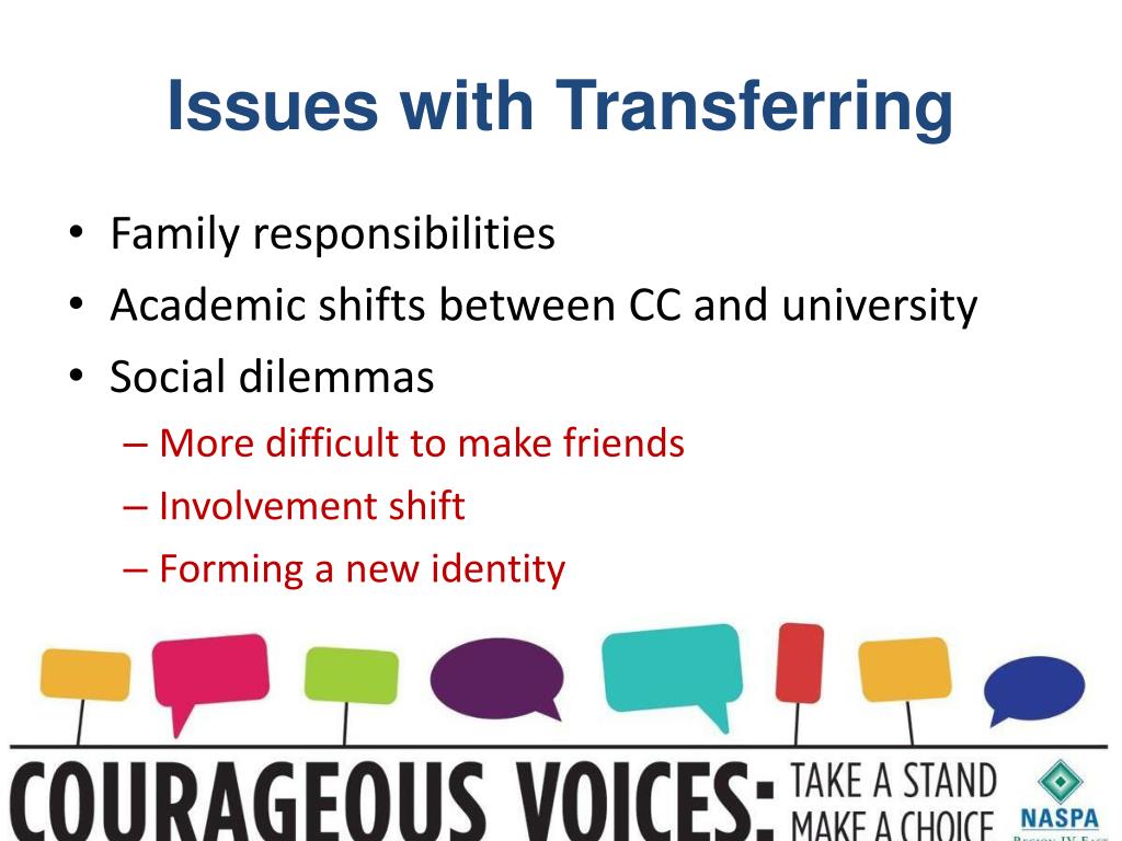 Issues with Transferring • Family responsibilities • Academic shifts between CC and university • Social dilemmas • More difficult to make friends • Involvement shift • Forming a new identity