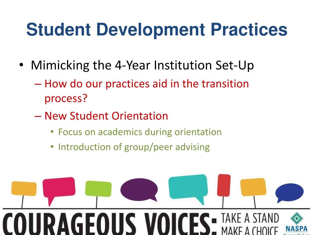 Student Development Practices • Mimicking the 4-Year Institution Set-Up • How do our practices aid in the transition process? • New Student Orientation • Focus on academics during orientation • Introduction of group/peer advising