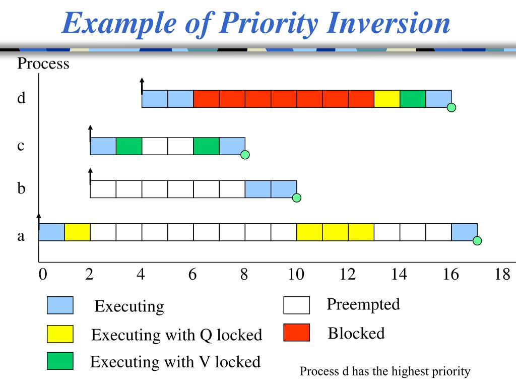 Example of Priority Inversion Process d c b a 0 2 4 6 8 10 12 14 16 18 Preempted Executing Blocked Executing with Q locked Executing with V locked Process d has the highest priority