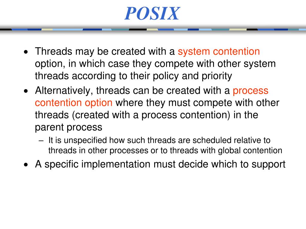 POSIX Threads may be created with a system contention option, in which case they compete with other system threads according to their policy and priority Alternatively, threads can be created with a process contention option where they must compete with other threads (created with a process contention) in the parent process • It is unspecified how such threads are scheduled relative to threads in other processes or to threads with global contention A specific implementation must decide which to support