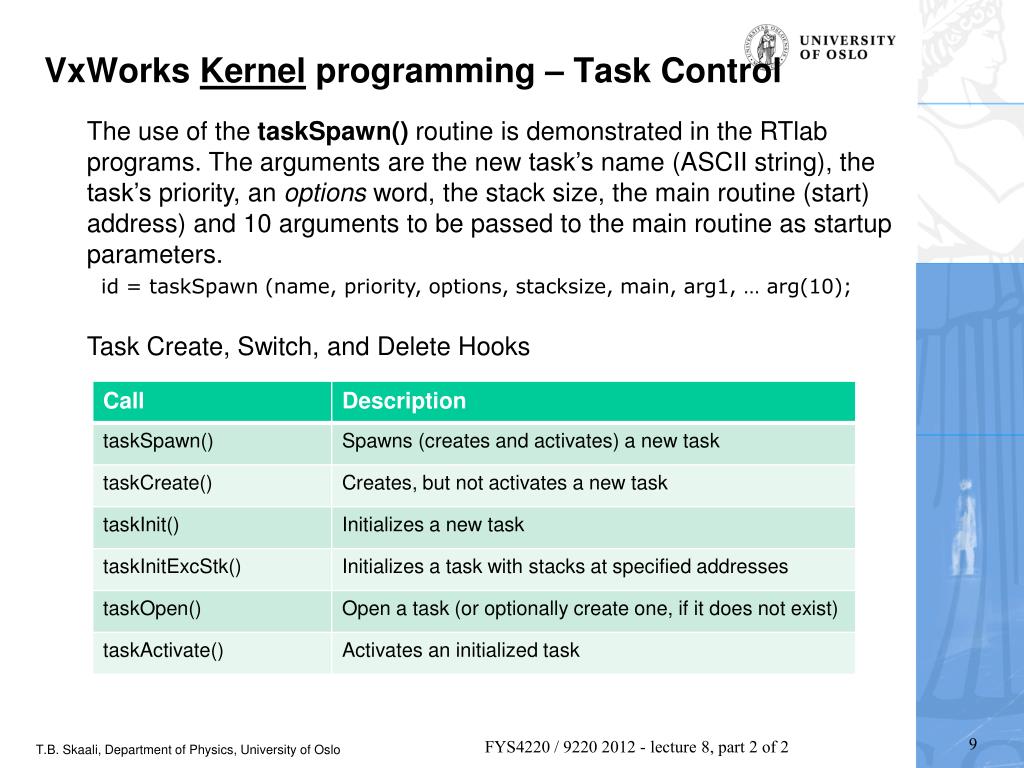 VxWorks Kernel programming – Task Control The useofthetaskSpawn()routine is demonstrated in theRTlab programs. The arguments arethenewtask’sname (ASCII string), thetask’spriority, an optionsword, thestacksize, themainroutine (start) address) and 10 arguments to be passed to themainroutine as startup parameters. id = taskSpawn (name, priority, options, stacksize, main, arg1, … arg(10); TaskCreate, Switch, and Delete Hooks FYS4220 / 9220 2012 - lecture 8, part 2 of 2