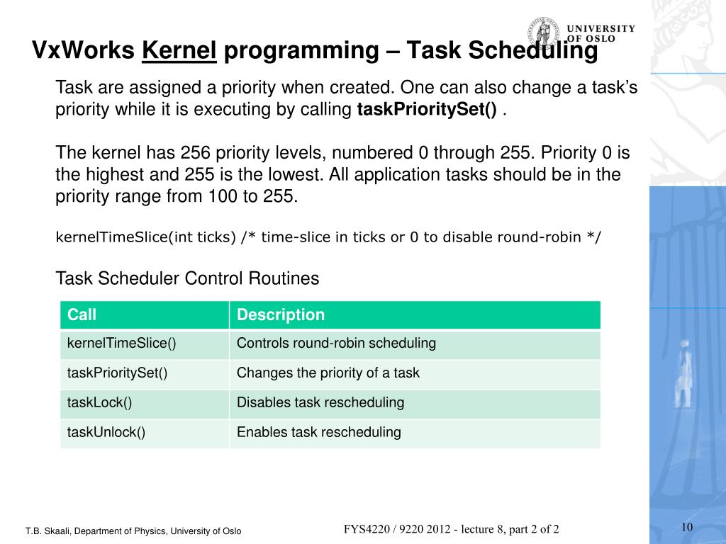 VxWorks Kernel programming – Task Scheduling Taskareassigned a prioritywhencreated. One canalsochange a task’sprioritywhile it is executing by calling taskPrioritySet() . The kernel has 256 prioritylevels, numbered 0 through 255. Priority 0 is thehighest and 255 is thelowest. All applicationtasksshould be in thepriority range from 100 to 255. kernelTimeSlice(intticks) /* time-slice in ticks or 0 to disableround-robin */ TaskScheduler Control Routines FYS4220 / 9220 2012 - lecture 8, part 2 of 2