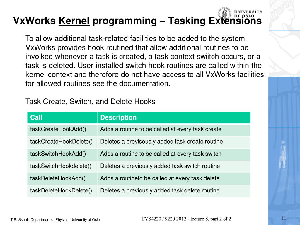 VxWorks Kernel programming – Tasking Extensions To allowadditionaltask-relatedfacilities to be added to the system, VxWorksprovides hook routinedthatallowadditionalroutines to be involkedwhenever a task is created, a taskcontextswiitchoccurs, or a task is deleted. User-installedswitch hook routinesarecalledwithinthekernelcontext and therefore do not have access to all VxWorksfacilities, for allowedroutinesseethedocumentation. TaskCreate, Switch, and Delete Hooks FYS4220 / 9220 2012 - lecture 8, part 2 of 2
