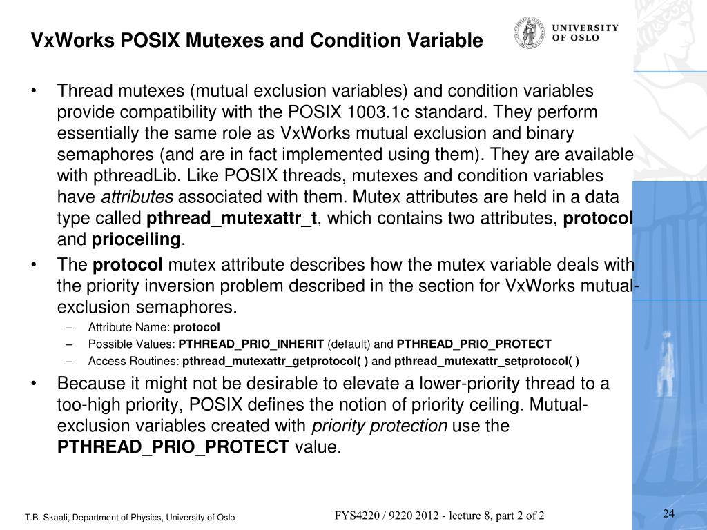 VxWorks POSIX Mutexes and Condition Variable • Thread mutexes (mutual exclusion variables) and condition variables provide compatibility with the POSIX 1003.1c standard. They perform essentially the same role as VxWorks mutual exclusion and binary semaphores (and are in fact implemented using them). They are available with pthreadLib. Like POSIX threads, mutexes and condition variables have attributes associated with them. Mutex attributes are held in a data type called pthread_mutexattr_t, which contains two attributes, protocol and prioceiling. • The protocol mutex attribute describes how the mutex variable deals with the priority inversion problem described in the section for VxWorks mutual-exclusion semaphores. • Attribute Name: protocol • Possible Values: PTHREAD_PRIO_INHERIT (default) and PTHREAD_PRIO_PROTECT • Access Routines: pthread_mutexattr_getprotocol( ) and pthread_mutexattr_setprotocol( ) • Because it might not be desirable to elevate a lower-priority thread to a too-high priority, POSIX defines the notion of priority ceiling. Mutual-exclusion variables created with priority protection use the PTHREAD_PRIO_PROTECT value. FYS4220 / 9220 2012 - lecture 8, part 2 of 2