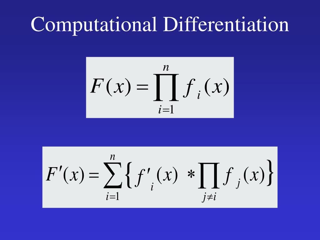 Computational Differentiation float F(float x) { int i; float ans = 1.0; for(i = 1; i <= n; i++) { ans = ans * f[i](x); } return ans; } float delta = . . .; /* small constant */ float F’(float x) { return (F(x+delta) - F(x)) / delta; }
