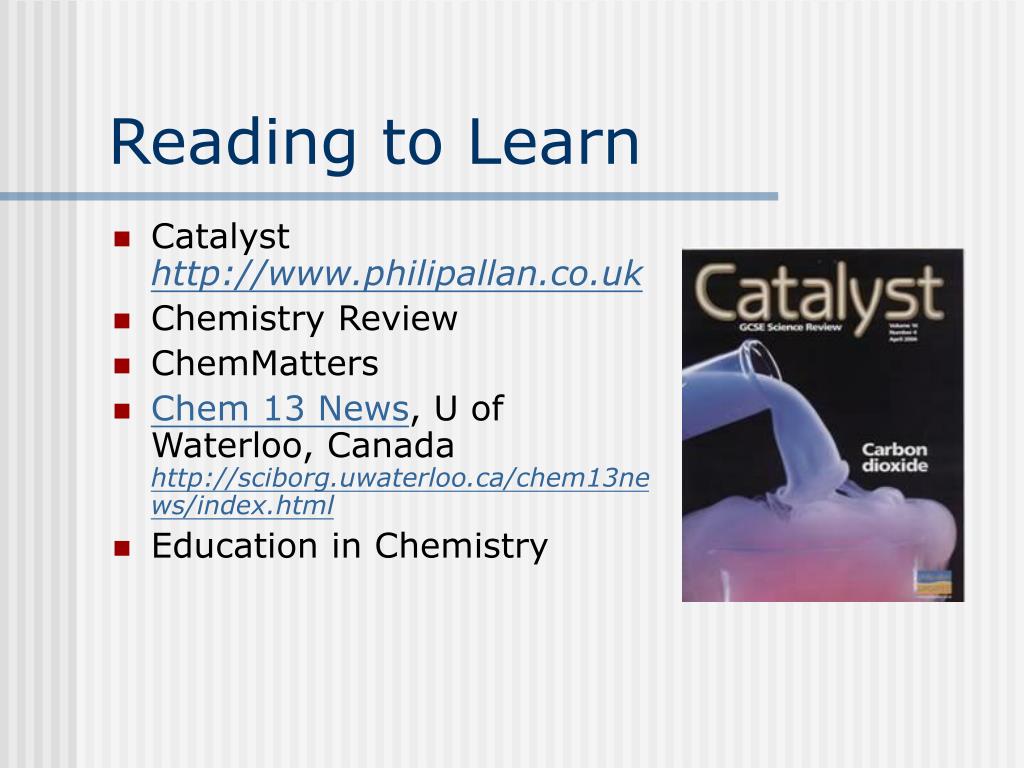Reading to Learn • Catalyst http://www.philipallan.co.uk • Chemistry Review • ChemMatters • Chem 13 News, U of Waterloo, Canada http://sciborg.uwaterloo.ca/chem13news/index.html • Education in Chemistry