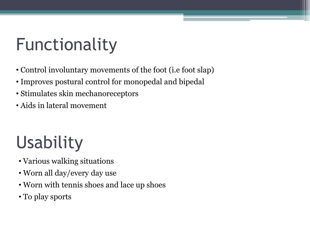 Functionality • Control involuntary movements of the foot (i.e foot slap) • Improves postural control for monopedal and bipedal • Stimulates skin mechanoreceptors • Aids in lateral movement Usability • Various walking situations • Worn all day/every day use • Worn with tennis shoes and lace up shoes • To play sports
