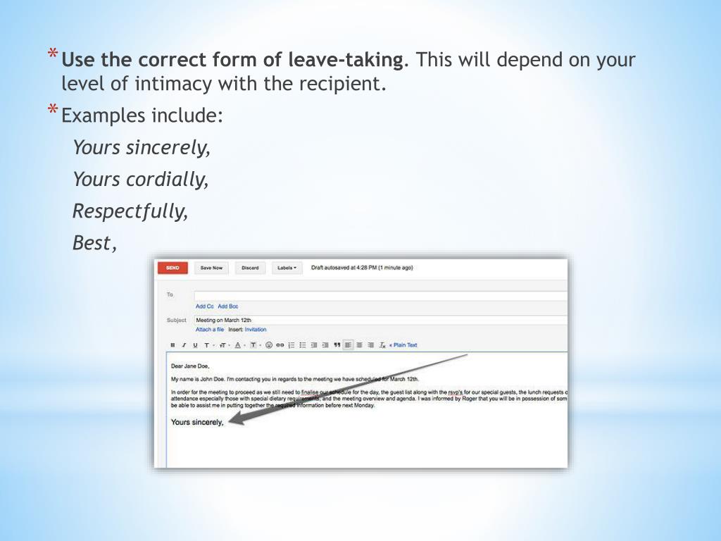 Usethecorrectformofleave-taking. Thiswilldepend on yourlevelofintimacywiththe recipient. • Examplesinclude: Yourssincerely, Yourscordially, Respectfully, Best,