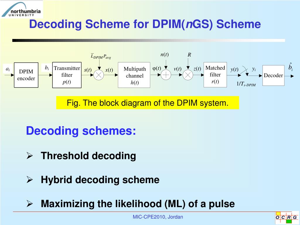 Decoding Scheme for DPIM(nGS) Scheme Fig. The block diagram of the DPIM system. • Decoding schemes: • Threshold decoding • Hybrid decoding scheme • Maximizing the likelihood (ML) of a pulse