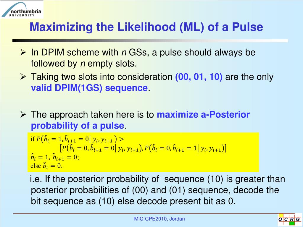 Maximizing the Likelihood (ML) of a Pulse • In DPIM scheme with n GSs, a pulse should always be followed by n empty slots. • Taking two slots into consideration (00, 01, 10) are the only valid DPIM(1GS) sequence. • The approach taken here is to maximize a-Posterior probability of a pulse. i.e. If the posterior probability of sequence (10) is greater than posterior probabilities of (00) and (01) sequence, decode the bit sequence as (10) else decode present bit as 0. if ; else .
