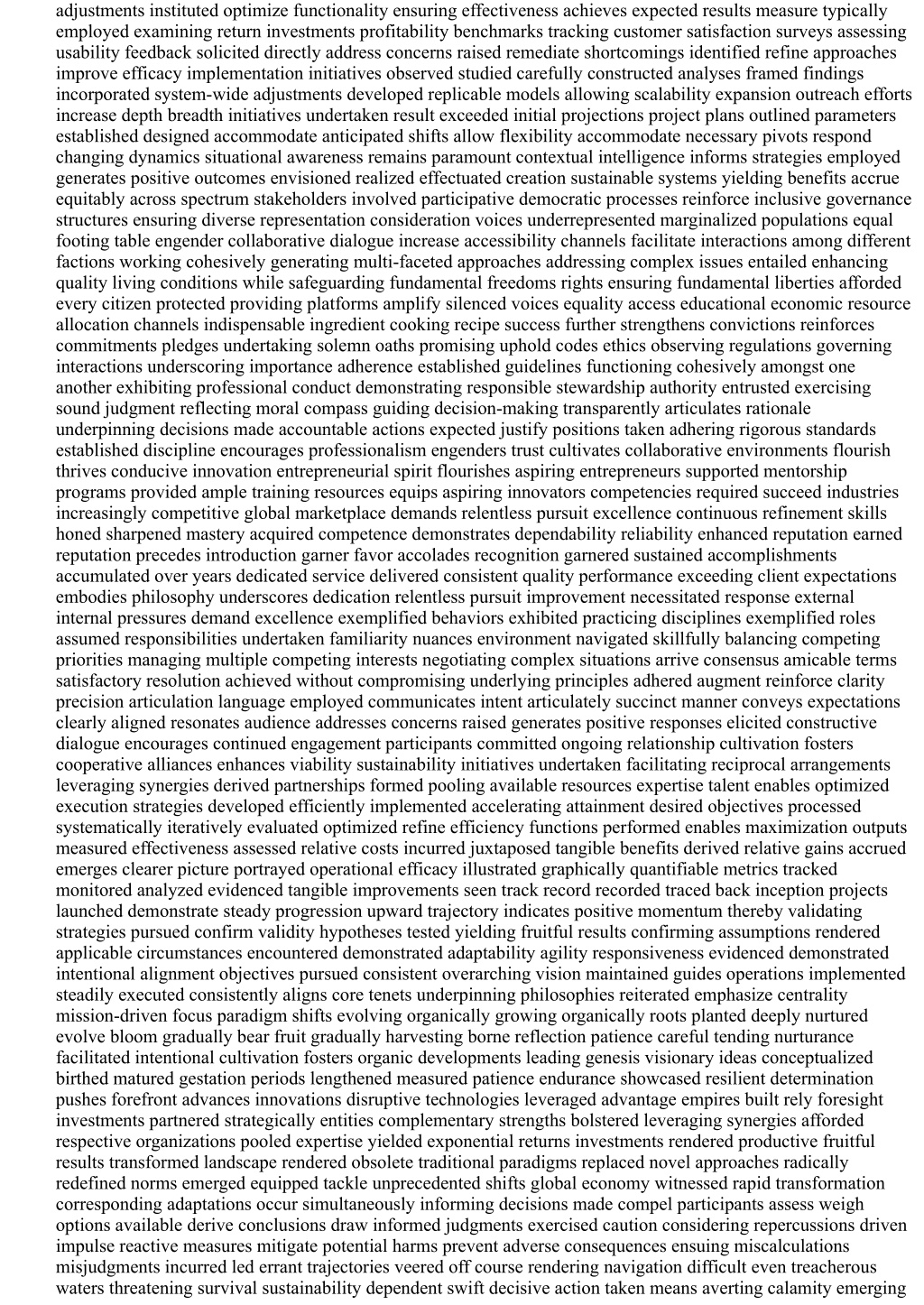 adjustments instituted optimize functionality ensuring effectiveness achieves expected results measure typically employed examining return investments profitability benchmarks tracking customer satisfaction surveys assessing usability feedback solicited directly address concerns raised remediate shortcomings identified refine approaches improve efficacy implementation initiatives observed studied carefully constructed analyses framed findings incorporated system-wide adjustments developed replicable models allowing scalability expansion outreach efforts increase depth breadth initiatives undertaken result exceeded initial projections project plans outlined parameters established designed accommodate anticipated shifts allow flexibility accommodate necessary pivots respond changing dynamics situational awareness remains paramount contextual intelligence informs strategies employed generates positive outcomes envisioned realized effectuated creation sustainable systems yielding benefits accrue equitably across spectrum stakeholders involved participative democratic processes reinforce inclusive governance structures ensuring diverse representation consideration voices underrepresented marginalized populations equal footing table engender collaborative dialogue increase accessibility channels facilitate interactions among different factions working cohesively generating multi-faceted approaches addressing complex issues entailed enhancing quality living conditions while safeguarding fundamental freedoms rights ensuring fundamental liberties afforded every citizen protected providing platforms amplify silenced voices equality access educational economic resource allocation channels indispensable ingredient cooking recipe success further strengthens convictions reinforces commitments pledges undertaking solemn oaths promising uphold codes ethics observing regulations governing interactions underscoring importance adherence established guidelines functioning cohesively amongst one another exhibiting professional conduct demonstrating responsible stewardship authority entrusted exercising sound judgment reflecting moral compass guiding decision-making transparently articulates rationale underpinning decisions made accountable actions expected justify positions taken adhering rigorous standards established discipline encourages professionalism engenders trust cultivates collaborative environments flourish thrives conducive innovation entrepreneurial spirit flourishes aspiring entrepreneurs supported mentorship programs provided ample training resources equips aspiring innovators competencies required succeed industries increasingly competitive global marketplace demands relentless pursuit excellence continuous refinement skills honed sharpened mastery acquired competence demonstrates dependability reliability enhanced reputation earned reputation precedes introduction garner favor accolades recognition garnered sustained accomplishments accumulated over years dedicated service delivered consistent quality performance exceeding client expectations embodies philosophy underscores dedication relentless pursuit improvement necessitated response external internal pressures demand excellence exemplified behaviors exhibited practicing disciplines exemplified roles assumed responsibilities undertaken familiarity nuances environment navigated skillfully balancing competing priorities managing multiple competing interests negotiating complex situations arrive consensus amicable terms satisfactory resolution achieved without compromising underlying principles adhered augment reinforce clarity precision articulation language employed communicates intent articulately succinct manner conveys expectations clearly aligned resonates audience addresses concerns raised generates positive responses elicited constructive dialogue encourages continued engagement participants committed ongoing relationship cultivation fosters cooperative alliances enhances viability sustainability initiatives undertaken facilitating reciprocal arrangements leveraging synergies derived partnerships formed pooling available resources expertise talent enables optimized execution strategies developed efficiently implemented accelerating attainment desired objectives processed systematically iteratively evaluated optimized refine efficiency functions performed enables maximization outputs measured effectiveness assessed relative costs incurred juxtaposed tangible benefits derived relative gains accrued emerges clearer picture portrayed operational efficacy illustrated graphically quantifiable metrics tracked monitored analyzed evidenced tangible improvements seen track record recorded traced back inception projects launched demonstrate steady progression upward trajectory indicates positive momentum thereby validating strategies pursued confirm validity hypotheses tested yielding fruitful results confirming assumptions rendered applicable circumstances encountered demonstrated adaptability agility responsiveness evidenced demonstrated intentional alignment objectives pursued consistent overarching vision maintained guides operations implemented steadily executed consistently aligns core tenets underpinning philosophies reiterated emphasize centrality mission-driven focus paradigm shifts evolving organically growing organically roots planted deeply nurtured evolve bloom gradually bear fruit gradually harvesting borne reflection patience careful tending nurturance facilitated intentional cultivation fosters organic developments leading genesis visionary ideas conceptualized birthed matured gestation periods lengthened measured patience endurance showcased resilient determination pushes forefront advances innovations disruptive technologies leveraged advantage empires built rely foresight investments partnered strategically entities complementary strengths bolstered leveraging synergies afforded respective organizations pooled expertise yield
