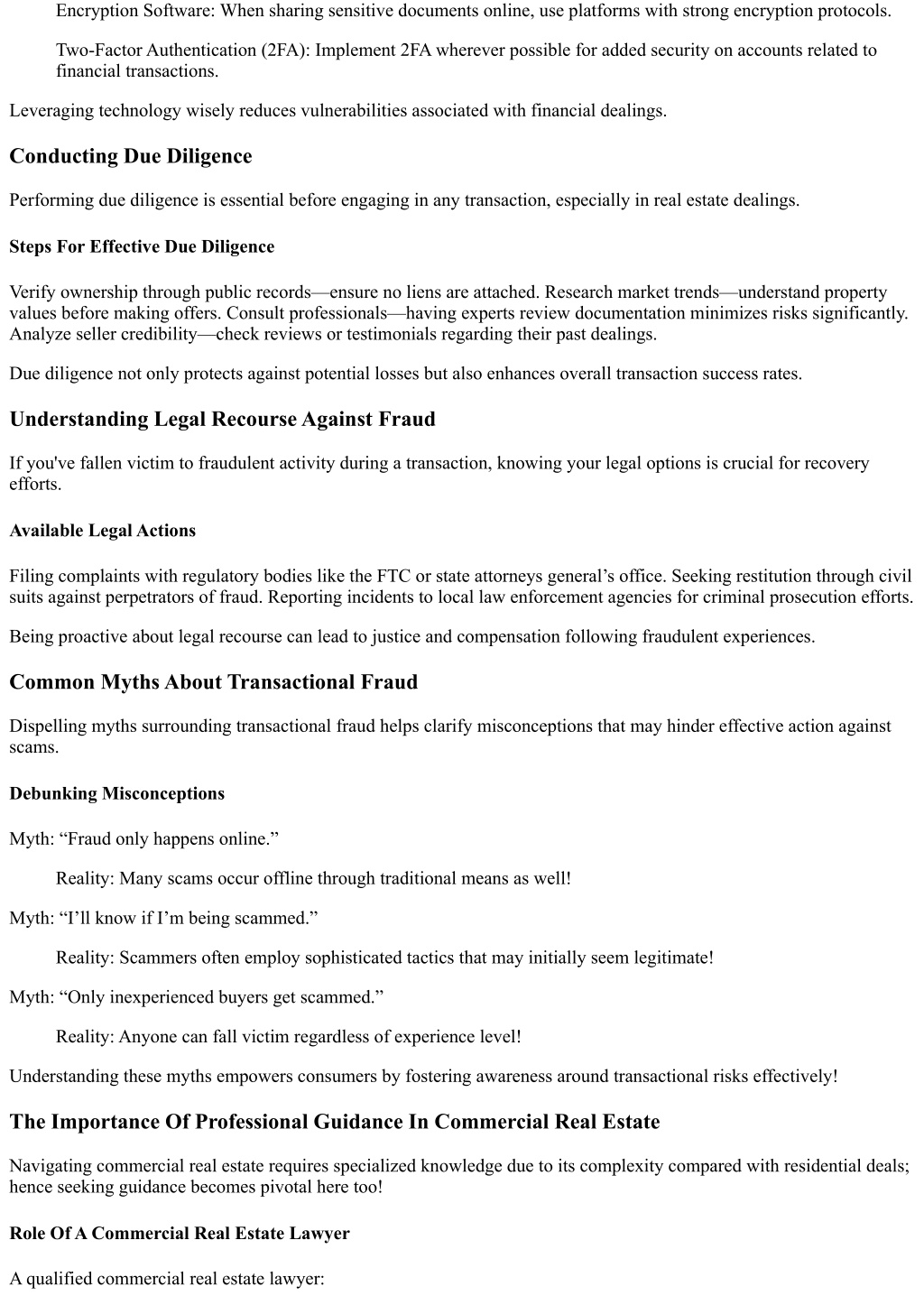 Encryption Software: When sharing sensitive documents online, use platforms with strong encryption protocols. Two-Factor Authentication (2FA): Implement 2FA wherever possible for added security on accounts related to financial transactions. Leveraging technology wisely reduces vulnerabilities associated with financial dealings. Conducting Due Diligence Performing due diligence is essential before engaging in any transaction, especially in real estate dealings. Steps For Effective Due Diligence Verify ownership through public records—ensure no liens are attached. Research market trends—understand property values before making offers. Consult professionals—having experts review documentation minimizes risks significantly. Analyze seller credibility—check reviews or testimonials regarding their past dealings. Due diligence not only protects against potential losses but also enhances overall transaction success rates. Understanding Legal Recourse Against Fraud If you've fallen victim to fraudulent activity during a transaction, knowing your legal options is crucial for recovery efforts. Available Legal Actions Filing complaints with regulatory bodies like the FTC or state attorneys general’s office. Seeking restitution through civil suits against perpetrators of fraud. Reporting incidents to local law enforcement agencies for criminal prosecution efforts. Being proactive about legal recourse can lead to justice and compensation following fraudulent experiences. Common Myths About Transactional Fraud Dispelling myths surrounding transactional fraud helps clarify misconceptions that may hinder effective action against scams. Debunking Misconceptions Myth: “Fraud only happens online.” Reality: Many scams occur offline through traditional means as well! Myth: “I’ll know if I’m being scammed.” Reality: Scammers often employ sophisticated tactics that may initially seem legitimate! Myth: “Only inexperienced buyers get scammed.” Reality: Anyone can fall victim regardless of experience level! Understanding these myths empowers consumers by fostering awareness around transactional risks effectively! The Importance Of Professional Guidance In Commercial Real Estate Navigating commercial real estate requires specialized knowledge due to its complexity compared with residential deals; hence seeking guidance becomes pivotal here too! Role Of A Commercial Real Estate Lawyer A qualified commercial real estate lawyer: