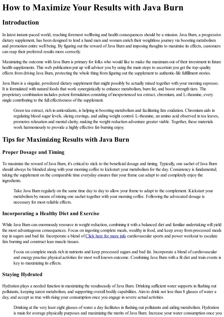 How to Maximize Your Results with Java Burn Introduction In latest instant-paced world, reaching foremost wellbeing and health consequences should be a mission. Java Burn, a progressive dietary supplement, has been designed to lend a hand men and women enrich their weightloss journey via boosting metabolism and promotion entire well being. By figuring out the reward of Java Burn and imposing thoughts to maximise its effects, customers can reap their preferred results more correctly. Maximizing the outcome with Java Burn is primary for folks who would like to make the maximum out of their investment in future health supplements. This web publication put up will advisor you by using the main steps to ascertain you get the top-quality effects from driving Java Burn, protecting the whole thing from figuring out the supplement to authentic-life fulfillment stories. Java Burn is a singular, powdered dietary supplement that might possibly be actually mixed together with your morning espresso. It is formulated with natural foods that work synergistically to enhance metabolism, burn fat, and boost strength tiers. The proprietary combination includes potent formulation consisting of inexperienced tea extract, chromium, and L-theanine, every single contributing to the full effectiveness of the supplement. Green tea extract, rich in antioxidants, is helping in boosting metabolism and facilitating fats oxidation. Chromium aids in regulating blood sugar levels, slicing cravings, and aiding weight control. L-theanine, an amino acid observed in tea leaves, promotes relaxation and mental clarity, making the weight reduction adventure greater viable. Together, these materials work harmoniously to provide a highly effective fat-burning enjoy. Tips for Maximizing Results with Java Burn Proper Dosage and Timing To maximize the reward of Java Burn, it's critical to stick to the beneficial dosage and timing. Typically, one sachet of Java Burn should always be blended along with your morning coffee to kickstart your metabolism for the day. Consistency is fundamental; taking the supplement on the comparable time everyday ensures that your frame can adapt to and completely enjoy the ingredients. Take Java Burn regularly on the same time day to day to allow your frame to adapt to the complement. Kickstart your metabolism by means of mixing one sachet together with your morning coffee. Following the advocated dosage is necessary for most reliable effects. Incorporating a Healthy Diet and Exercise While Java Burn can enormously resource in weight reduction, combining it with a balanced diet and familiar undertaking will yield the most advantageous consequences. Focus on ingesting complete meals, wealthy in food, and keep away from processed meals top in sugars and bad fat. Incorporate a blend of Click here for more info cardiovascular sports and power workout to escalate fats burning and construct lean muscle tissues. Focus on complete meals rich in nutrients and keep processed sugars and bad fat. Incorporate a blend of cardiovascular and energy practise physical activities for most well known outcome. Combining Java Burn with a fit diet and train events is key to maximizing its effects. Staying Hydrated Hydration plays a needed function in maximizing the resultseasily of Java Burn. Drinking sufficient water supports in flushing out pollutants, keeping surest metabolism, and supporting overall bodily capabilities. Aim to drink not less than 8 glasses of water a day, and accept as true with rising your consumption once you engage in severe actual activities. Drinking at the very least eight glasses of water a day facilitates in flushing out pollutants and aiding metabolism. Hydration is main for average physically purposes and maximizing the merits of Java Burn. Increase your water consumption once you