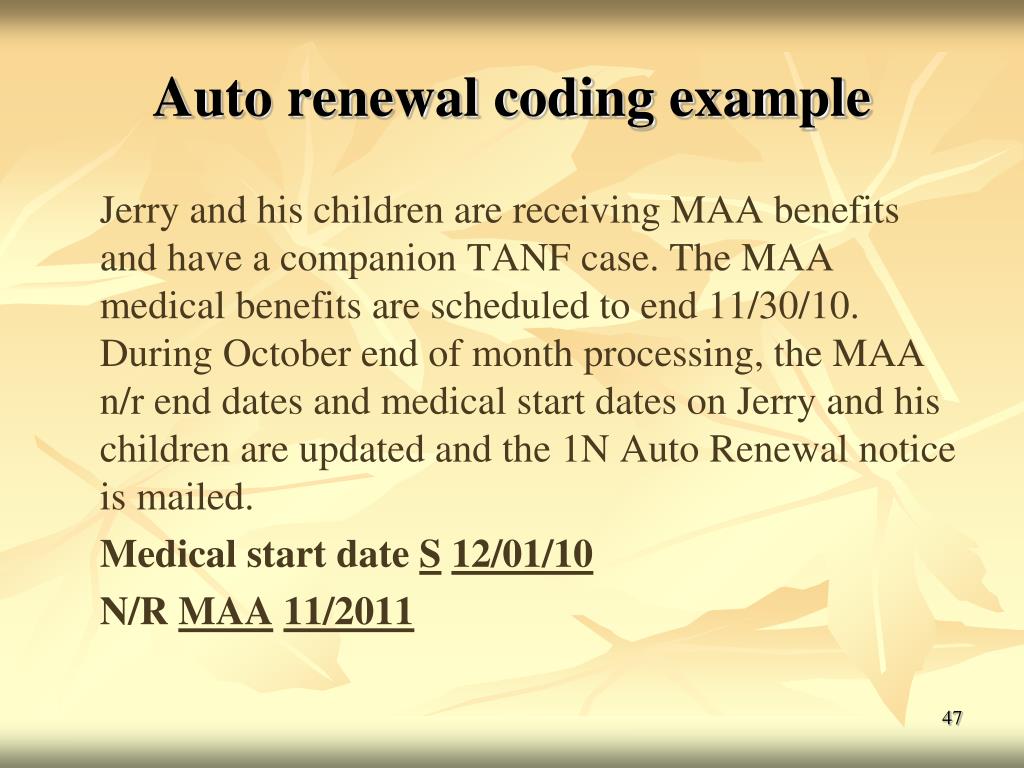 Auto renewal coding example Jerry and his children are receiving MAA benefits and have a companion TANF case. The MAA medical benefits are scheduled to end 11/30/10. During October end of month processing, the MAA n/r end dates and medical start dates on Jerry and his children are updated and the 1N Auto Renewal notice is mailed. Medical start date S12/01/10 N/R MAA11/2011 47