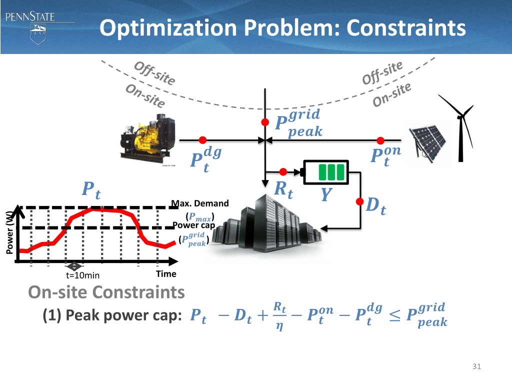 Optimization Problem: Constraints Off-site Off-site On-site On-site Max. Demand () Powercap () Power (W) Time On-site Constraints t=10min (1) Peak power cap: