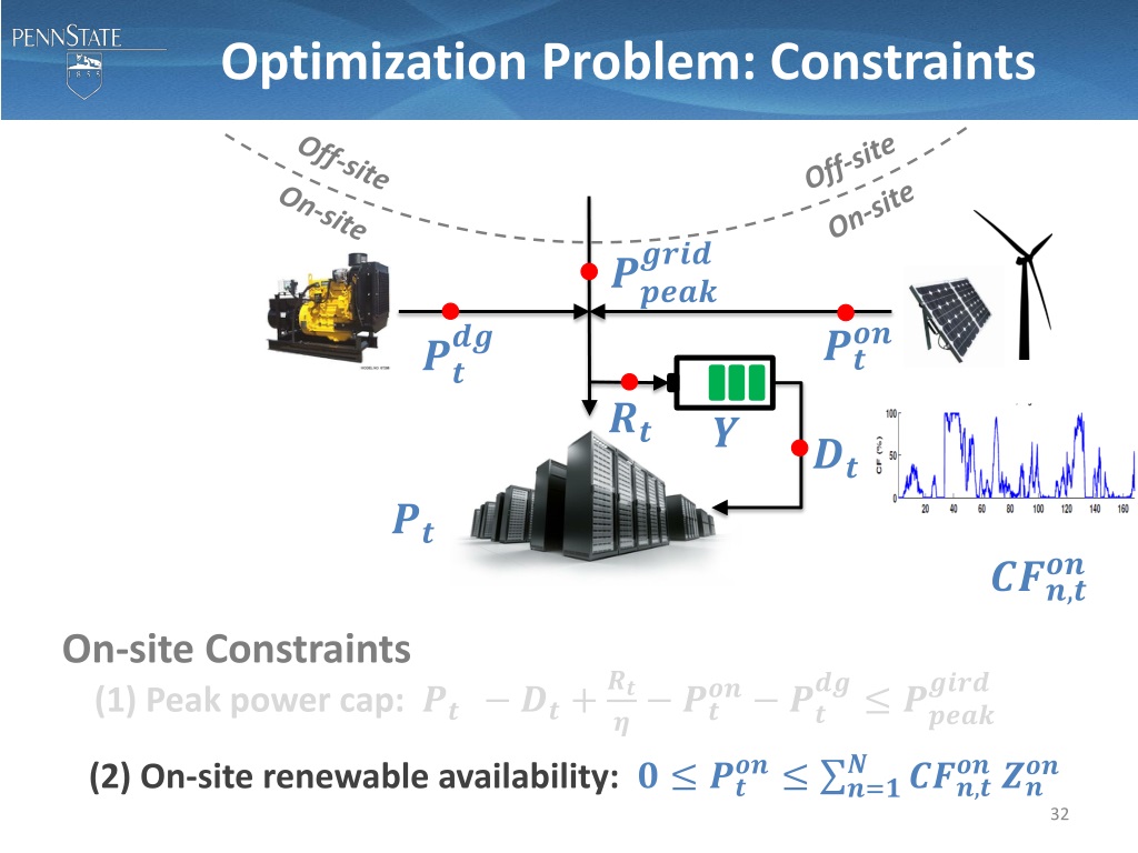 Optimization Problem: Constraints Off-site Off-site On-site On-site On-site Constraints (1) Peak power cap: (2) On-site renewable availability: