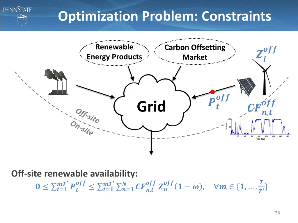 Optimization Problem: Constraints Renewable Energy Products Carbon Offsetting Market Grid Off-site On-site Off-site renewable availability: