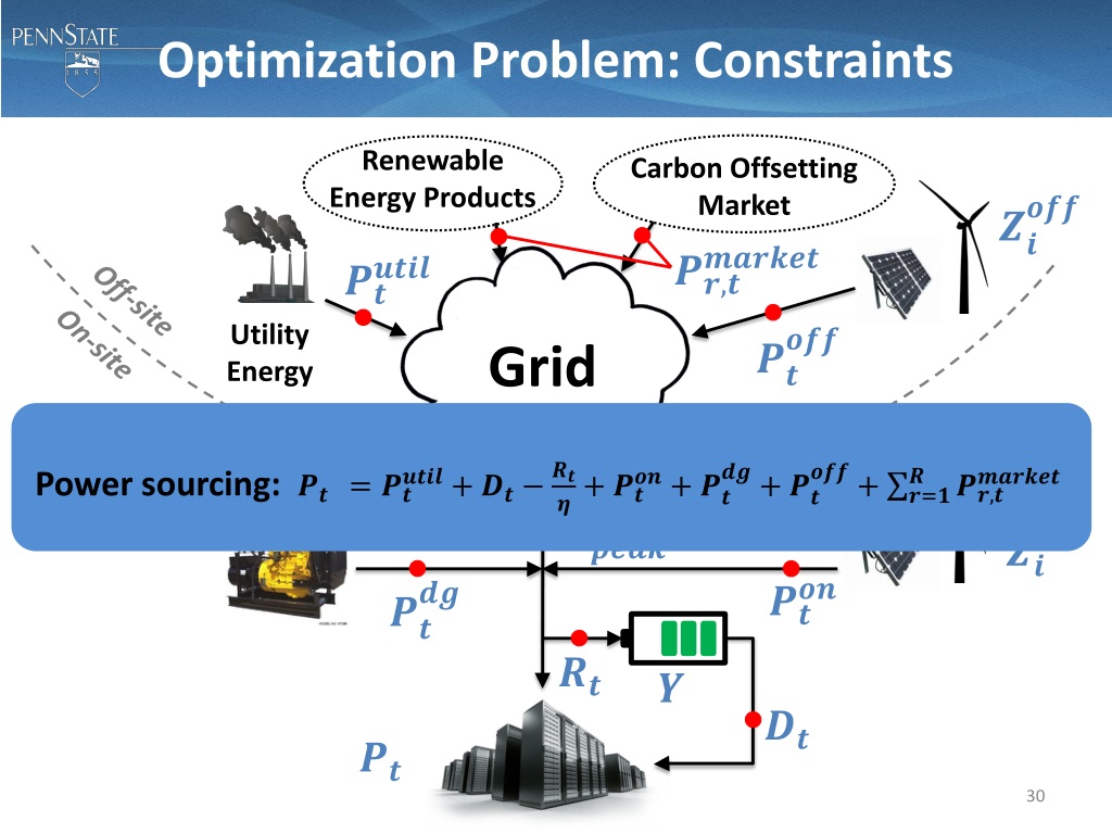 Optimization Problem: Constraints Renewable Energy Products Carbon Offsetting Market Off-site Utility Energy On-site Grid Power sourcing: