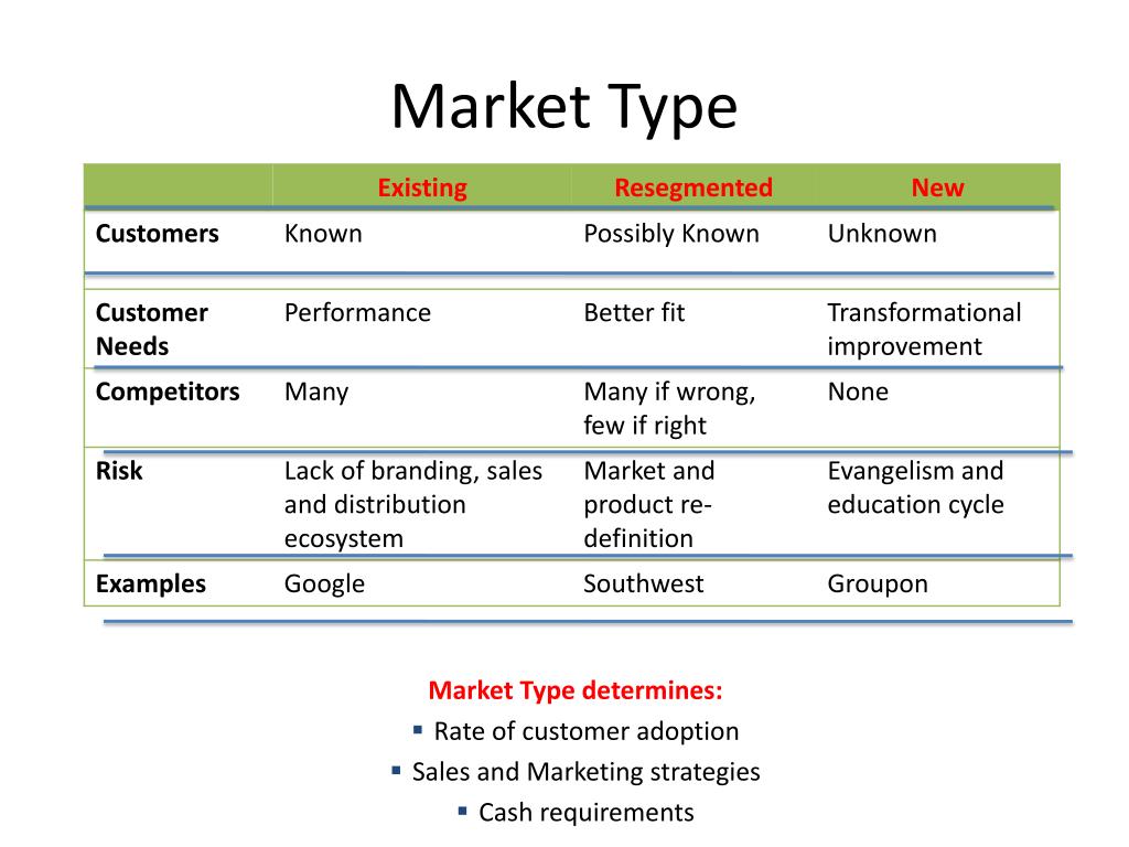 Market Type Market Type determines: • Rate of customer adoption • Sales and Marketing strategies • Cash requirements