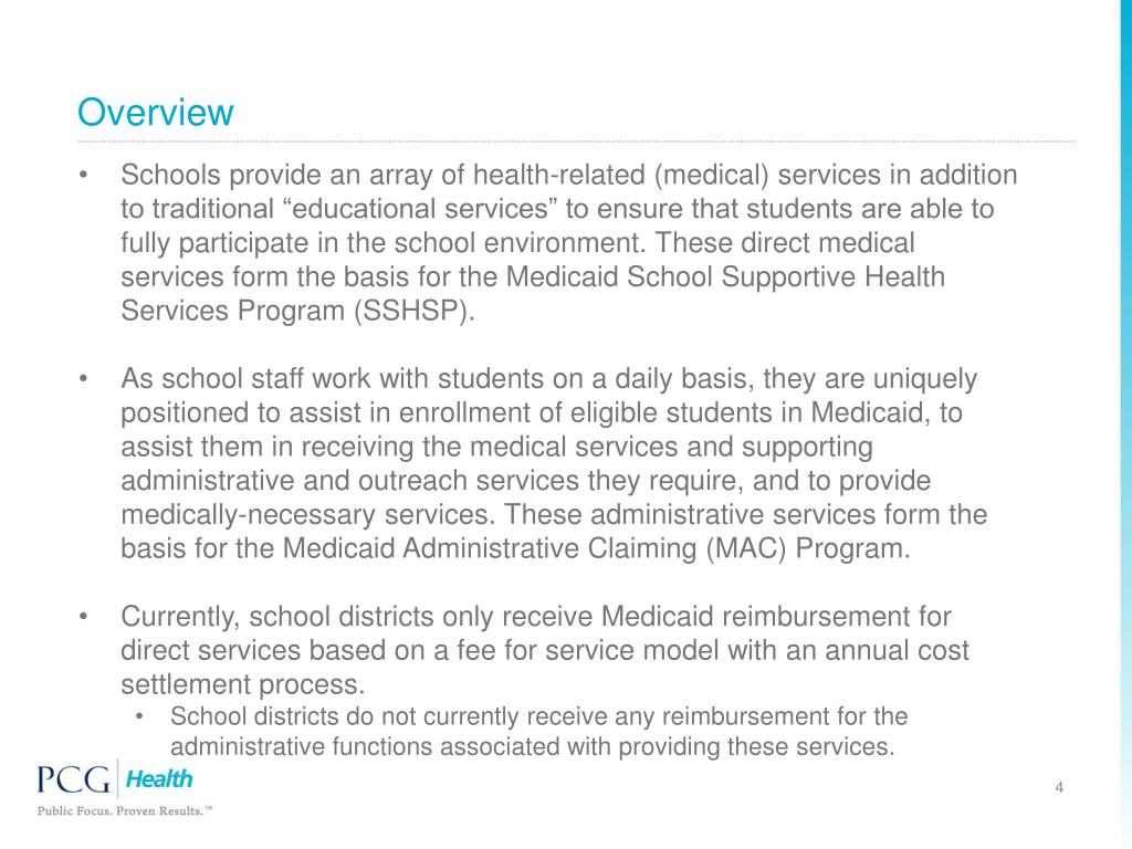Schools provide an array of health-related (medical) services in addition to traditional “educational services” to ensure that students are able to fully participate in the school environment. These direct medical services form the basis for the Medicaid School Supportive Health Services Program (SSHSP). As school staff work with students on a daily basis, they are uniquely positioned to assist in enrollment of eligible students in Medicaid, to assist them in receiving the medical services and supporting administrative and outreach services they require, and to provide medically-necessary services. These administrative services form the basis for the Medicaid Administrative Claiming (MAC) Program. Currently, school districts only receive Medicaid reimbursement for direct services based on a fee for service model with an annual cost settlement process. School districts do not currently receive any reimbursement for the administrative functions associated with providing these services. Overview