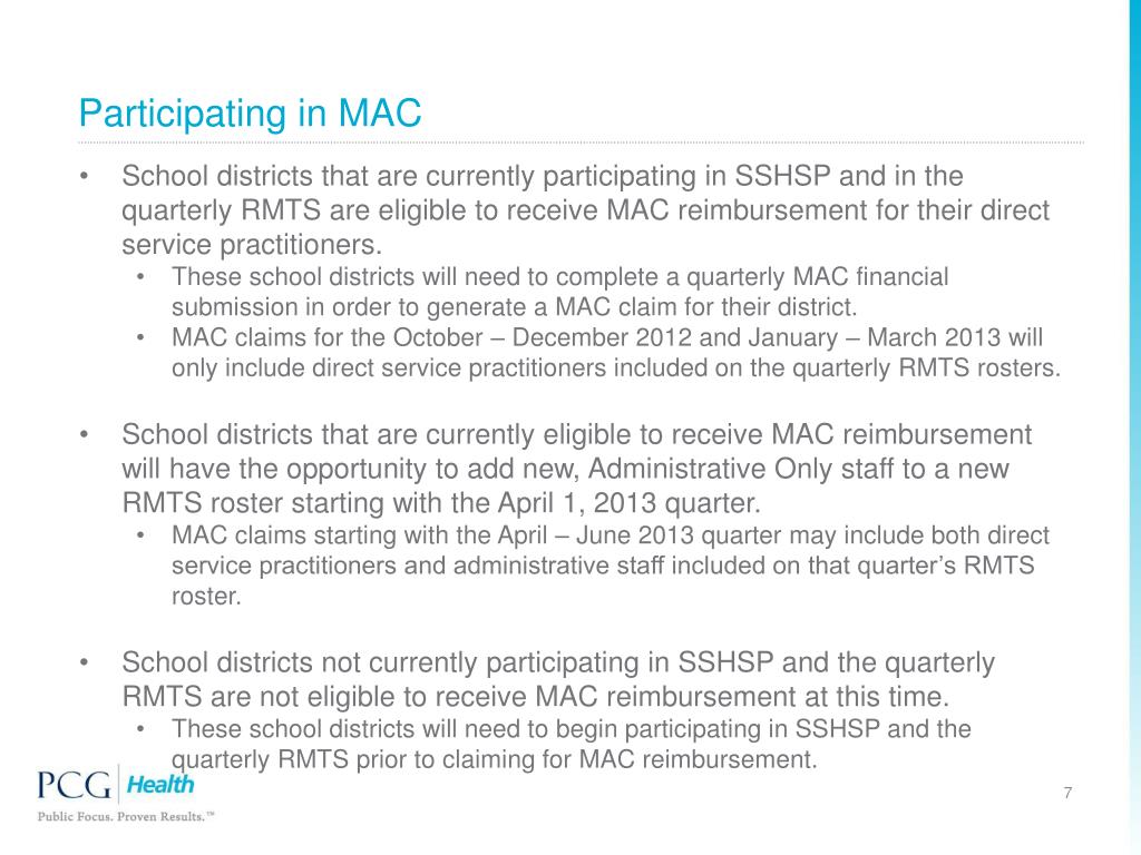 School districts can receive MAC reimbursement by meeting 3 main program requirements: Participate in SSHSP. Participate in the quarterly Random Moment Time Study (RMTS) (a requirement to participate in SSHSP). Submit quarterly financial data to be used in calculating the MAC claim. Most school districts are already meeting the requirements of participation in SSHSP and in the quarterly RMTS. School districts meeting the first two requirements need only to complete and submit quarterly financial data in order to access MAC reimbursement. MAC Participation Requirements
