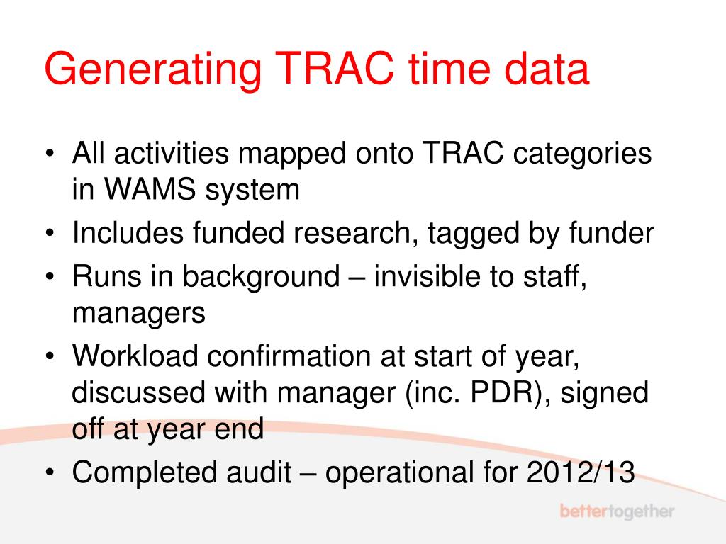 Generating TRAC time data • All activities mapped onto TRAC categories in WAMS system • Includes funded research, tagged by funder • Runs in background – invisible to staff, managers • Workload confirmation at start of year, discussed with manager (inc. PDR), signed off at year end • Completed audit – operational for 2012/13