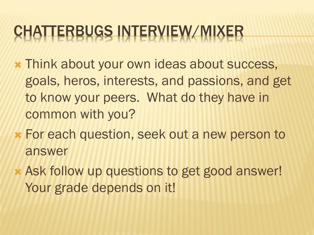 Think about your own ideas about success, goals, heros, interests, and passions, and get to know your peers. What do they have in common with you? For each question, seek out a new person to answer Ask follow up questions to get good answer! Your grade depends on it! Chatterbugs Interview/Mixer