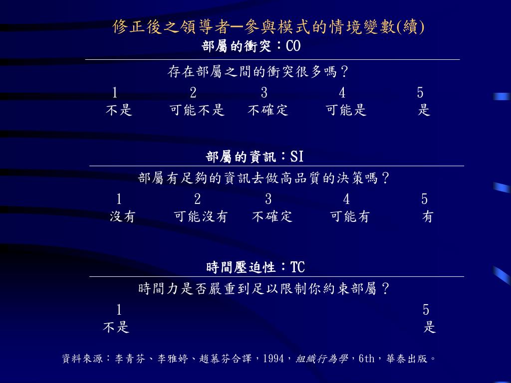 部屬的衝突:CO 存在部屬之間的衝突很多嗎? 1 2 3 4 5 不是 可能不是 不確定 可能是 是 部屬的資訊:SI 時間壓迫性:TC 部屬有足夠的資訊去做高品質的決策嗎? 時間力是否嚴重到足以限制你約束部屬? 1 2 3 4 5 沒有 可能沒有 不確定 可能有 有 1 5 不是 是 修正後之領導者─參與模式的情境變數(續) 資料來源:李青芬、李雅婷、趙慕芬合譯,1994,組織行為學,6th,華泰出版。