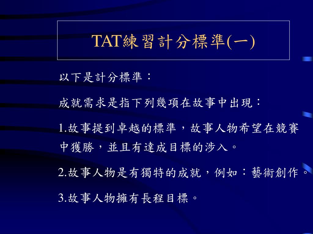以下是計分標準: 成就需求是指下列幾項在故事中出現: 1.故事提到卓越的標準,故事人物希望在競賽中獲勝,並且有達成目標的涉入。 2.故事人物是有獨特的成就,例如:藝術創作。 3.故事人物擁有長程目標。 TAT練習計分標準(一)