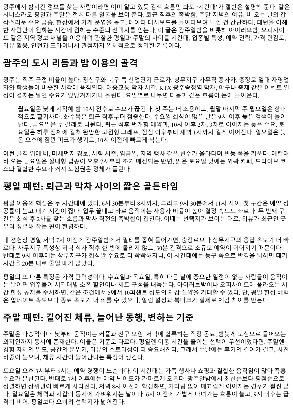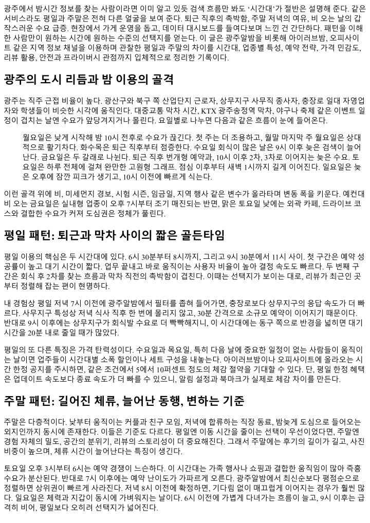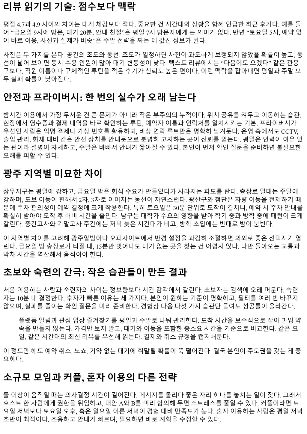 광주에서밤시간정보를찾는사람이라면이미알고있듯검색흐름만봐도 ‘시간대’가절반은설명해준다. 같은 서비스라도평일과주말은전혀다른얼굴을보여준다. 퇴근직후의촉박함, 주말저녁의여유, 비오는날의갑 작스러운수요급증. 현장에서가게운영을돕고, 데이터대시보드를들여다보며느낀건간단하다. 패턴을이해 한사람만이원하는시간에원하는수준의선택지를얻는다. 이글은광주알밤을비롯해아이러브밤, 오피사이 트같은지역정보채널을이용하며관찰한평일과주말의차이를시간대, 업종별특성, 예약전략, 가격민감도, 리뷰활용, 안전과프라이버시관점까지입체적으로정리한기록이다. 광주의도시리듬과밤이용의골격 광주는직주근접비율이높다. 광산구와북구쪽산업단지근로자, 상무지구사무직종사자, 충장로일대자영업 자와학생들이비슷한시각에움직인다. 대중교통막차시간, KTX 광주송정역막차, 야구나축제같은이벤트일 정이겹치는날엔수요가앞당겨지거나몰린다. 요일별로나누면다음과같은흐름이눈에들어온다. 월요일은낮게시작해밤 10시전후로수요가끊긴다. 첫주는더조용하고, 월말마지막주월요일은상대 적으로활기차다. 화수목은퇴근직후부터점증한다. 수요일회식이많은날은 9시이후늦은검색이늘어 난다. 금요일은두갈래로나뉜다. 퇴근직후번개형예약과, 10시이후 2차, 3차로이어지는늦은수요. 토 요일은하루전체에걸쳐완만한고원형그래프. 점심이후부터새벽 1시까지길게이어진다. 일요일은늦 은오후에잠깐피크가생기고, 10시이전에빠르게식는다. 이런골격위에비, 미세먼지경보, 시험시즌, 임금일, 지역행사같은변수가올라타며변동폭을키운다. 예컨대 비오는금요일은실내형업종이오후 7시부터조기매진되는반면, 맑은토요일낮에는외곽카페, 드라이브코 스와결합한수요가커져도심권은정체가풀린다. 평일패턴: 퇴근과막차사이의짧은골든타임 평일이용의핵심은두시간대에있다. 6시 30분부터 8시까지, 그리고 9시 30분에서 11시사이. 첫구간은예약성 공률이높고대기시간이짧다. 업무끝내고바로움직이는사용자비율이높아결정속도도빠르다. 두번째구 간은회식후 2차를찾는흐름과막차직전의촉박함이겹친다. 이때는선택지가보이는대로, 리뷰가최근인곳 부터정렬해잡는편이현명하다. 내경험상평일저녁 7시이전에광주알밤에서필터를좁혀들어가면, 충장로보다상무지구의응답속도가더빠 르다. 사무지구특성상저녁식사직후한번에몰리지않고, 30분간격으로소규모예약이이어지기때문이다. 반대로 9시이후에는상무지구가회식발수요로더빡빡해지니, 이시간대에는동구쪽으로반경을넓히면대기 시간을 20분내로줄일때가많았다. 평일의또다른특징은가격탄력성이다. 수요일과목요일, 특히다음날에중요한일정이없는사람들이움직이 는날이면업주들이시간대별소폭할인이나세트구성을내놓는다. 아이러브밤이나오피사이트에올라오는시 간한정공지를주시하면, 같은조건에서 5에서 10퍼센트정도의체감절약을기대할수있다. 단, 평일한정혜택 은업데이트속도보다종료속도가더빠를수있으니, 알림설정과북마크가실제로체감차이를만든다. 주말패턴: 길어진체류, 늘어난동행, 변하는기준 주말은다층적이다. 낮부터움직이는커플과친구모임, 저녁에합류하는직장동료, 밤늦게도심으로들어오는 외지인까지동시에존재한다. 이들은기준도다르다. 평일엔이동시간을줄이는선택이우선이었다면, 주말엔 경험자체의밀도, 공간의분위기, 리뷰의스토리성이더중요해진다. 그래서주말에는후기의길이가길고, 사진 비중이높으며, 체류시간이늘어난다는특징이생긴다. 토요일오후 3시부터 6시는예약경쟁이느슨하다. 이시간대는가족행사나쇼핑과결합한움직임이많아즉흥 수요가분산된다. 반대로 7시이후에는예약난이도가가파르게오른다. 광주알밤에서최신순보다평점순으로 정렬하면상위권이빠르게사라진다. 저녁 8시이전에확정하면, 기다림없이매끄럽게이어지는경우가훨씬많 다. 일요일은체력과지갑이동시에가벼워지는날이다. 6시이전에가볍게다녀가는흐름이늘고, 9시이후는급 격히비어, 평일보다오히려선택지가넓어진다.