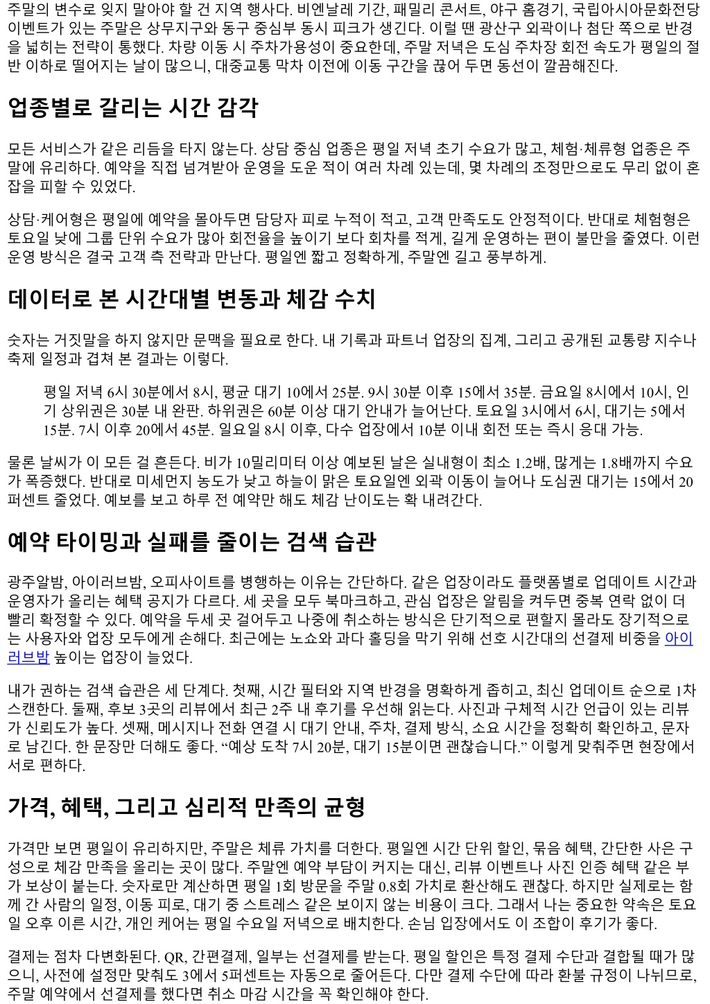 주말의변수로잊지말아야할건지역행사다. 비엔날레기간, 패밀리콘서트, 야구홈경기, 국립아시아문화전당 이벤트가있는주말은상무지구와동구중심부동시피크가생긴다. 이럴땐광산구외곽이나첨단쪽으로반경 을넓히는전략이통했다. 차량이동시주차가용성이중요한데, 주말저녁은도심주차장회전속도가평일의절 반이하로떨어지는날이많으니, 대중교통막차이전에이동구간을끊어두면동선이깔끔해진다. 업종별로갈리는시간감각 모든서비스가같은리듬을타지않는다. 상담중심업종은평일저녁초기수요가많고, 체험·체류형업종은주 말에유리하다. 예약을직접넘겨받아운영을도운적이여러차례있는데, 몇차례의조정만으로도무리없이혼 잡을피할수있었다. 상담·케어형은평일에예약을몰아두면담당자피로누적이적고, 고객만족도도안정적이다. 반대로체험형은 토요일낮에그룹단위수요가많아회전율을높이기보다회차를적게, 길게운영하는편이불만을줄였다. 이런 운영방식은결국고객측전략과만난다. 평일엔짧고정확하게, 주말엔길고풍부하게. 데이터로본시간대별변동과체감수치 숫자는거짓말을하지않지만문맥을필요로한다. 내기록과파트너업장의집계, 그리고공개된교통량지수나 축제일정과겹쳐본결과는이렇다. 평일저녁 6시 30분에서 8시, 평균대기 10에서 25분. 9시 30분이후 15에서 35분. 금요일 8시에서 10시, 인 기상위권은 30분내완판. 하위권은 60분이상대기안내가늘어난다. 토요일 3시에서 6시, 대기는 5에서 15분. 7시이후 20에서 45분. 일요일 8시이후, 다수업장에서 10분이내회전또는즉시응대가능. 물론날씨가이모든걸흔든다. 비가 10밀리미터이상예보된날은실내형이최소 1.2배, 많게는 1.8배까지수요 가폭증했다. 반대로미세먼지농도가낮고하늘이맑은토요일엔외곽이동이늘어나도심권대기는 15에서 20 퍼센트줄었다. 예보를보고하루전예약만해도체감난이도는확내려간다. 예약타이밍과실패를줄이는검색습관 광주알밤, 아이러브밤, 오피사이트를병행하는이유는간단하다. 같은업장이라도플랫폼별로업데이트시간과 운영자가올리는혜택공지가다르다. 세곳을모두북마크하고, 관심업장은알림을켜두면중복연락없이더 빨리확정할수있다. 예약을두세곳걸어두고나중에취소하는방식은단기적으로편할지몰라도장기적으로 는사용자와업장모두에게손해다. 최근에는노쇼와과다홀딩을막기위해선호시간대의선결제비중을아이 러브밤높이는업장이늘었다. 내가권하는검색습관은세단계다. 첫째, 시간필터와지역반경을명확하게좁히고, 최신업데이트순으로 1차 스캔한다. 둘째, 후보 3곳의리뷰에서최근 2주내후기를우선해읽는다. 사진과구체적시간언급이있는리뷰 가신뢰도가높다. 셋째, 메시지나전화연결시대기안내, 주차, 결제방식, 소요시간을정확히확인하고, 문자 로남긴다. 한문장만더해도좋다. “예상도착 7시 20분, 대기 15분이면괜찮습니다.” 이렇게맞춰주면현장에서 서로편하다. 가격, 혜택, 그리고심리적만족의균형 가격만보면평일이유리하지만, 주말은체류가치를더한다. 평일엔시간단위할인, 묶음혜택, 간단한사은구 성으로체감만족을올리는곳이많다. 주말엔예약부담이커지는대신, 리뷰이벤트나사진인증혜택같은부 가보상이붙는다. 숫자로만계산하면평일 1회방문을주말 0.8회가치로환산해도괜찮다. 하지만실제로는함 께간사람의일정, 이동피로, 대기중스트레스같은보이지않는비용이크다. 그래서나는중요한약속은토요 일오후이른시간, 개인케어는평일수요일저녁으로배치한다. 손님입장에서도이조합이후기가좋다. 결제는점차다변화된다. QR, 간편결제, 일부는선결제를받는다. 평일할인은특정결제수단과결합될때가많 으니, 사전에설정만맞춰도 3에서 5퍼센트는자동으로줄어든다. 다만결제수단에따라환불규정이나뉘므로, 주말예약에서선결제를했다면취소마감시간을꼭확인해야한다.