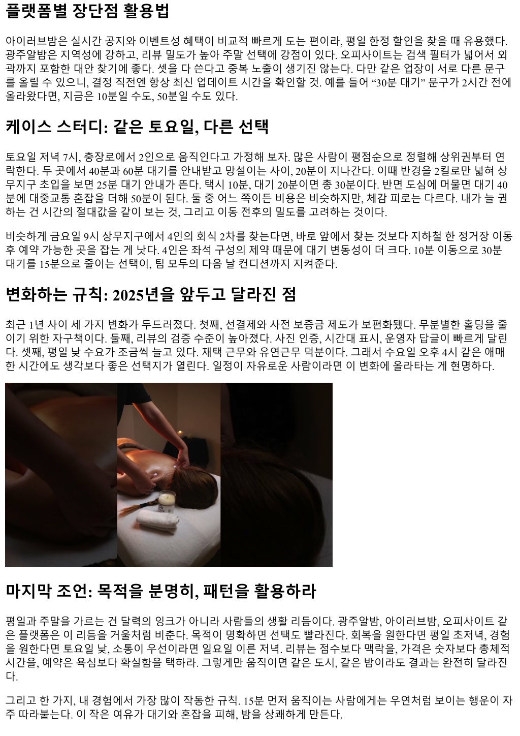 플랫폼별장단점활용법 아이러브밤은실시간공지와이벤트성혜택이비교적빠르게도는편이라, 평일한정할인을찾을때유용했다. 광주알밤은지역성에강하고, 리뷰밀도가높아주말선택에강점이있다. 오피사이트는검색필터가넓어서외 곽까지포함한대안찾기에좋다. 셋을다쓴다고중복노출이생기진않는다. 다만같은업장이서로다른문구 를올릴수있으니, 결정직전엔항상최신업데이트시간을확인할것. 예를들어 “30분대기” 문구가 2시간전에 올라왔다면, 지금은 10분일수도, 50분일수도있다. 케이스스터디: 같은토요일, 다른선택 토요일저녁 7시, 충장로에서 2인으로움직인다고가정해보자. 많은사람이평점순으로정렬해상위권부터연 락한다. 두곳에서 40분과 60분대기를안내받고망설이는사이, 20분이지나간다. 이때반경을 2킬로만넓혀상 무지구초입을보면 25분대기안내가뜬다. 택시 10분, 대기 20분이면총 30분이다. 반면도심에머물면대기 40 분에대중교통혼잡을더해 50분이된다. 둘중어느쪽이든비용은비슷하지만, 체감피로는다르다. 내가늘권 하는건시간의절대값을같이보는것, 그리고이동전후의밀도를고려하는것이다. 비슷하게금요일 9시상무지구에서 4인의회식 2차를찾는다면, 바로앞에서찾는것보다지하철한정거장이동 후예약가능한곳을잡는게낫다. 4인은좌석구성의제약때문에대기변동성이더크다. 10분이동으로 30분 대기를 15분으로줄이는선택이, 팀모두의다음날컨디션까지지켜준다. 변화하는규칙: 2025년을앞두고달라진점 최근 1년사이세가지변화가두드러졌다. 첫째, 선결제와사전보증금제도가보편화됐다. 무분별한홀딩을줄 이기위한자구책이다. 둘째, 리뷰의검증수준이높아졌다. 사진인증, 시간대표시, 운영자답글이빠르게달린 다. 셋째, 평일낮수요가조금씩늘고있다. 재택근무와유연근무덕분이다. 그래서수요일오후 4시같은애매 한시간에도생각보다좋은선택지가열린다. 일정이자유로운사람이라면이변화에올라타는게현명하다. 마지막조언: 목적을분명히, 패턴을활용하라 평일과주말을가르는건달력의잉크가아니라사람들의생활리듬이다. 광주알밤, 아이러브밤, 오피사이트같 은플랫폼은이리듬을거울처럼비춘다. 목적이명확하면선택도빨라진다. 회복을원한다면평일초저녁, 경험 을원한다면토요일낮, 소통이우선이라면일요일이른저녁. 리뷰는점수보다맥락을, 가격은숫자보다총체적 시간을, 예약은욕심보다확실함을택하라. 그렇게만움직이면같은도시, 같은밤이라도결과는완전히달라진 다. 그리고한가지, 내경험에서가장많이작동한규칙. 15분먼저움직이는사람에게는우연처럼보이는행운이자 주따라붙는다. 이작은여유가대기와혼잡을피해, 밤을상쾌하게만든다.