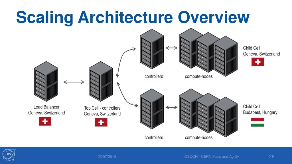 Scaling Architecture Overview Child Cell Geneva, Switzerland compute-nodes controllers Child Cell Budapest, Hungary Load Balancer Geneva, Switzerland Top Cell - controllers Geneva, Switzerland compute-nodes controllers OSCON - CERN Mass and Agility