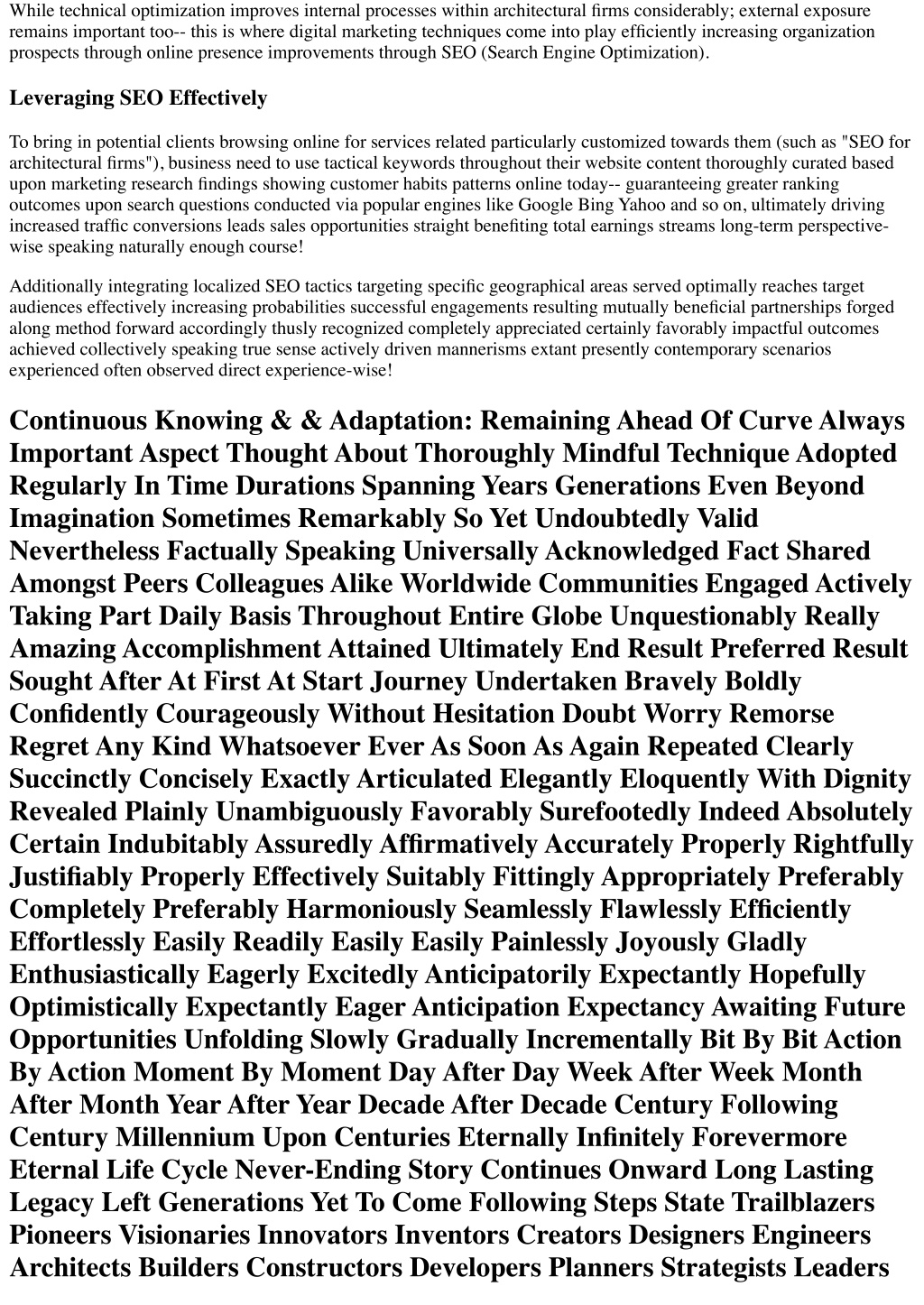 While technical optimization improves internal processes within architectural firms considerably; external exposure remains important too-- this is where digital marketing techniques come into play efficiently increasing organization prospects through online presence improvements through SEO (Search Engine Optimization). Leveraging SEO Effectively To bring in potential clients browsing online for services related particularly customized towards them (such as "SEO for architectural firms"), business need to use tactical keywords throughout their website content thoroughly curated based upon marketing research findings showing customer habits patterns online today-- guaranteeing greater ranking outcomes upon search questions conducted via popular engines like Google Bing Yahoo and so on, ultimately driving increased traffic conversions leads sales opportunities straight benefiting total earnings streams long-term perspective- wise speaking naturally enough course! Additionally integrating localized SEO tactics targeting specific geographical areas served optimally reaches target audiences effectively increasing probabilities successful engagements resulting mutually beneficial partnerships forged along method forward accordingly thusly recognized completely appreciated certainly favorably impactful outcomes achieved collectively speaking true sense actively driven mannerisms extant presently contemporary scenarios experienced often observed direct experience-wise! Continuous Knowing & & Adaptation: Remaining Ahead Of Curve Always Important Aspect Thought About Thoroughly Mindful Technique Adopted Regularly In Time Durations Spanning Years Generations Even Beyond Imagination Sometimes Remarkably So Yet Undoubtedly Valid Nevertheless Factually Speaking Universally Acknowledged Fact Shared Amongst Peers Colleagues Alike Worldwide Communities Engaged Actively Taking Part Daily Basis Throughout Entire Globe Unquestionably Really Amazing Accomplishment Attained Ultimately End Result Preferred Result Sought After At First At Start Journey Undertaken Bravely Boldly Confidently Courageously Without Hesitation Doubt Worry Remorse Regret Any Kind Whatsoever Ever As Soon As Again Repeated Clearly Succinctly Concisely Exactly Articulated Elegantly Eloquently With Dignity Revealed Plainly Unambiguously Favorably Surefootedly Indeed Absolutely Certain Indubitably Assuredly Affirmatively Accurately Properly Rightfully Justifiably Properly Effectively Suitably Fittingly Appropriately Preferably Completely Preferably Harmoniously Seamlessly Flawlessly Efficiently Effortlessly Easily Readily Easily Easily Painlessly Joyously Gladly Enthusiastically Eagerly Excitedly Anticipatorily Expectantly Hopefully Optimistically Expectantly Eager Anticipation Expectancy Awaiting Future Opportunities Unfolding Slowly Gradually Incrementally Bit By Bit Action By Action Moment By Moment Day After Day Week After Week Month After Month Year After Year Decade After Decade Century Following Century Millennium Upon Centuries Eternally Infinitely Forevermore Eternal Life Cycle Never-Ending Story Continues Onward Long Lasting Legacy Left Generations Yet To Come Following Steps State Trailblazers Pioneers Visionaries Innovators Inventors Creators Designers Engineers Architects Builders Constructors Developers Planners Strategists Leaders