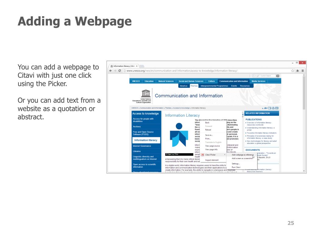 Adding a Webpage You can add a webpage to Citavi with just one click using the Picker. Or you can add text from a website as a quotation or abstract.
