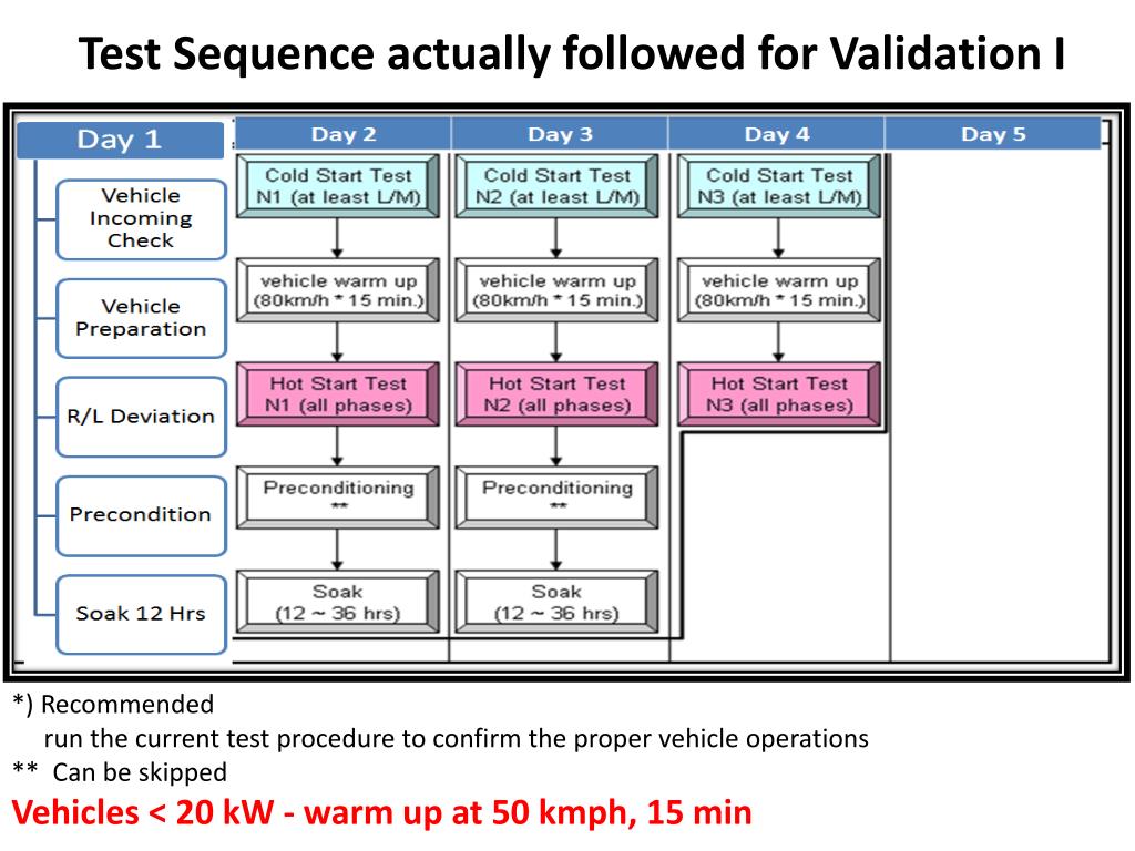 Test Sequence actually followed for Validation I *) Recommended run the current test procedure to confirm the proper vehicle operations ** Can be skipped Vehicles < 20 kW - warm up at 50 kmph, 15 min