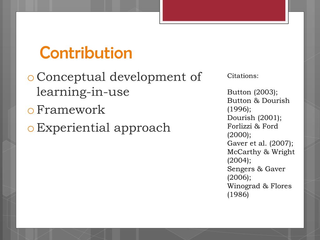 Contribution • Conceptual development of learning-in-use • Framework • Experiential approach Citations: Button (2003); Button & Dourish (1996); Dourish(2001); Forlizzi& Ford (2000); Gaveret al. (2007); McCarthy & Wright (2004); Sengers& Gaver (2006); Winograd & Flores (1986)