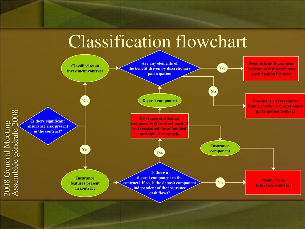 Classification flowchart Are any elements of the benefit driven by discretionary participation Classified as an investment contract Product is an Investment Contract with discretionary participation features Yes No Deposit component Product is an Investment Contract without discretionary participation features No Is there significant insurance risk present in the contract? Insurance and deposit components of contract must, if not recognised, be unbundled and valued separately Insurance component Yes Yes Is there a deposit component to the contract? If so, is the deposit component independent of the insurance cash flows? Insurance features present in contract Product is an Insurance Contract No