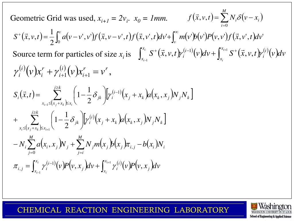 CHEMICAL REACTION ENGINEERING LABORATORY Source term for particles of size xi is Geometric Grid was used, xi+1 = 2vi. x0 = 1mm.