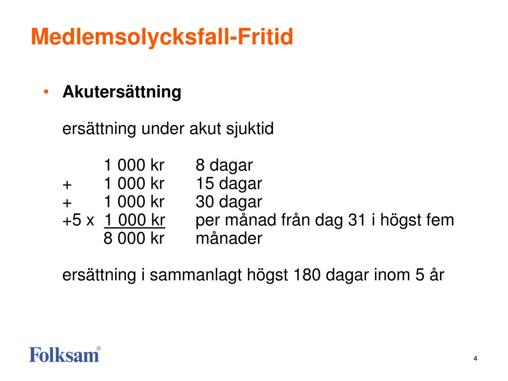 Medlemsolycksfall-Fritid • Akutersättningersättning under akut sjuktid 1 000 kr 8 dagar + 1 000 kr 15 dagar + 1 000 kr 30 dagar +5 x 1 000 kr per månad från dag 31 i högst fem 8 000 kr månaderersättning i sammanlagt högst 180 dagar inom 5 år