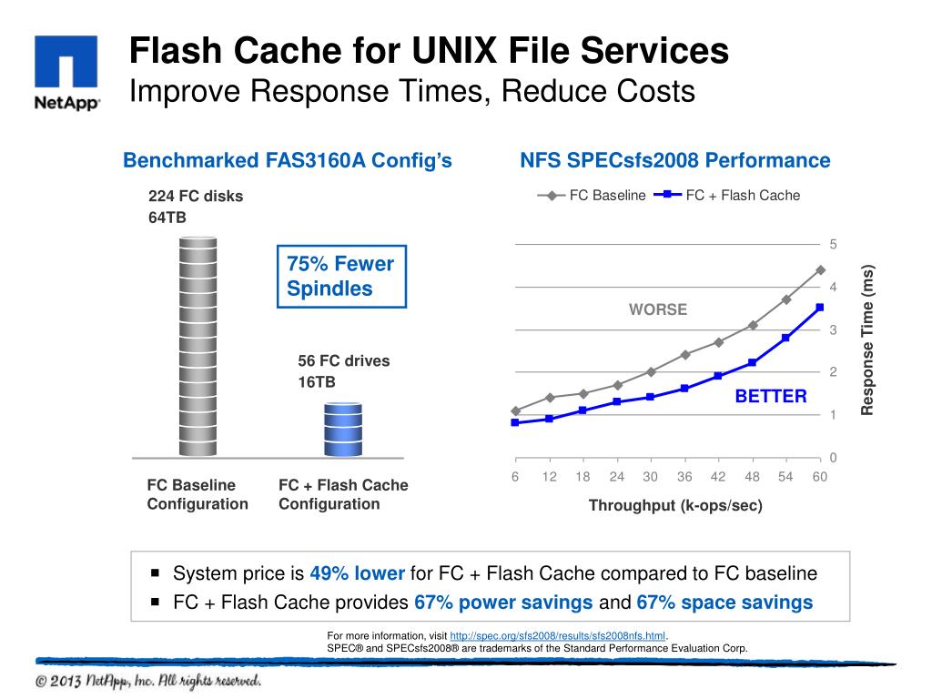 Flash Cache for UNIX File Services Improve Response Times, Reduce Costs Benchmarked FAS3160A Config’s NFS SPECsfs2008 Performance 224 FC disks 64TB 75% Fewer Spindles WORSE Response Time (ms) 56 FC drives 16TB BETTER FC Baseline Configuration FC + Flash Cache Configuration Throughput (k-ops/sec) • System price is 49% lower for FC + Flash Cache compared to FC baseline • FC + Flash Cache provides 67% power savings and 67% space savings For more information, visit http://spec.org/sfs2008/results/sfs2008nfs.html. SPEC® and SPECsfs2008® are trademarks of the Standard Performance Evaluation Corp.