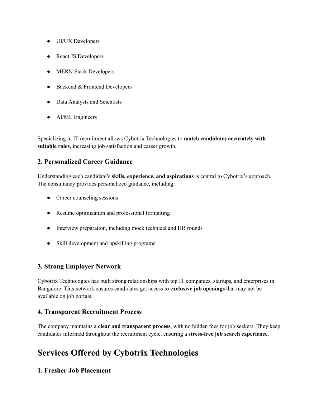● UI/UX Developers ● React JS Developers ● MERN Stack Developers ● Backend & Frontend Developers ● Data Analysts and Scientists ● AI/ML Engineers Specializing in IT recruitment allows Cybotrix Technologies to match candidates accurately with suitable roles, increasing job satisfaction and career growth. 2. Personalized Career Guidance Understanding each candidate’s skills, experience, and aspirations is central to Cybotrix’s approach. The consultancy provides personalized guidance, including: ● Career counseling sessions ● Resume optimization and professional formatting ● Interview preparation, including mock technical and HR rounds ● Skill development and upskilling programs 3. Strong Employer Network Cybotrix Technologies has built strong relationships with top IT companies, startups, and enterprises in Bangalore. This network ensures candidates get access to exclusive job openings that may not be available on job portals. 4. Transparent Recruitment Process The company maintains a clear and transparent process, with no hidden fees for job seekers. They keep candidates informed throughout the recruitment cycle, ensuring a stress-free job search experience. Services Offered by Cybotrix Technologies 1. Fresher Job Placement