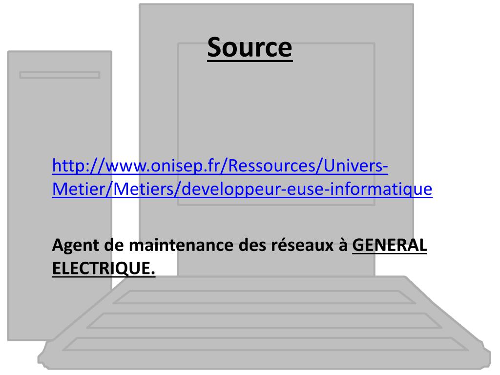 Source http://www.onisep.fr/Ressources/Univers-Metier/Metiers/developpeur-euse-informatique Agent de maintenance des réseaux à GENERAL ELECTRIQUE.