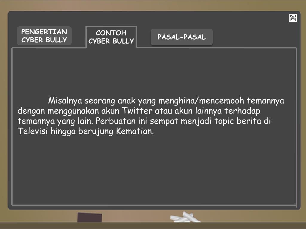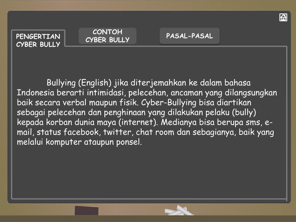 CONTOH CYBER BULLY PASAL-PASAL PENGERTIAN CYBER BULLY Bullying (English) jikaditerjemahkankedalambahasa Indonesia berartiintimidasi, pelecehan, ancaman yang dilangsungkanbaiksecara verbal maupunfisik. Cyber-Bullying bisadiartikansebagaipelecehandanpenghinaan yang dilakukanpelaku (bully) kepadakorbanduniamaya (internet). Medianyabisaberupasms, e-mail, status facebook, twitter, chat room dansebagianya, baik yang melaluikomputerataupunponsel.