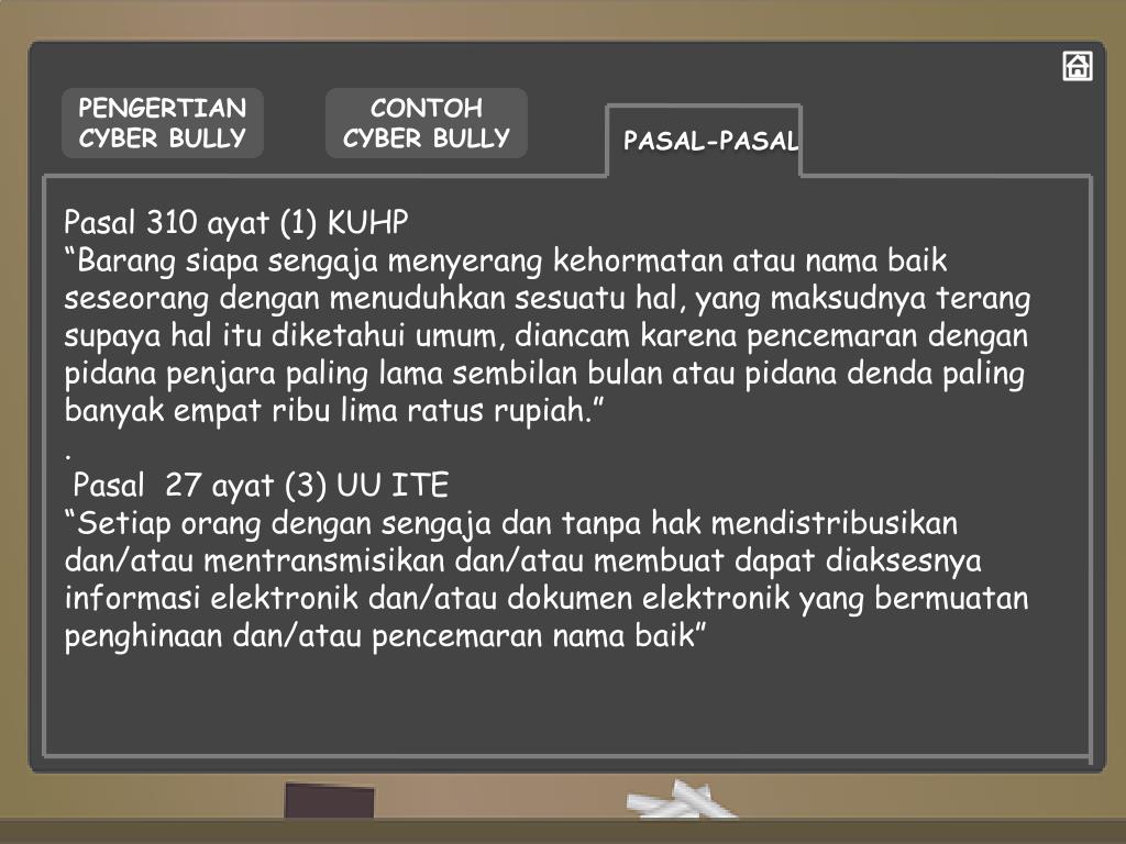 PENGERTIAN CYBER BULLY CONTOH CYBER BULLY PASAL-PASAL Pasal 310 ayat (1) KUHP “Barangsiapasengajamenyerangkehormatanataunamabaikseseorangdenganmenuduhkansesuatuhal, yang maksudnyaterangsupayahalitudiketahuiumum, diancamkarenapencemarandenganpidanapenjara paling lama sembilanbulanataupidanadenda paling banyakempatribu lima ratus rupiah.” . Pasal 27 ayat (3) UU ITE “Setiaporangdengansengajadantanpahakmendistribusikandan/ataumentransmisikandan/ataumembuatdapatdiaksesnyainformasielektronikdan/ataudokumenelektronik yang bermuatanpenghinaandan/ataupencemarannamabaik”