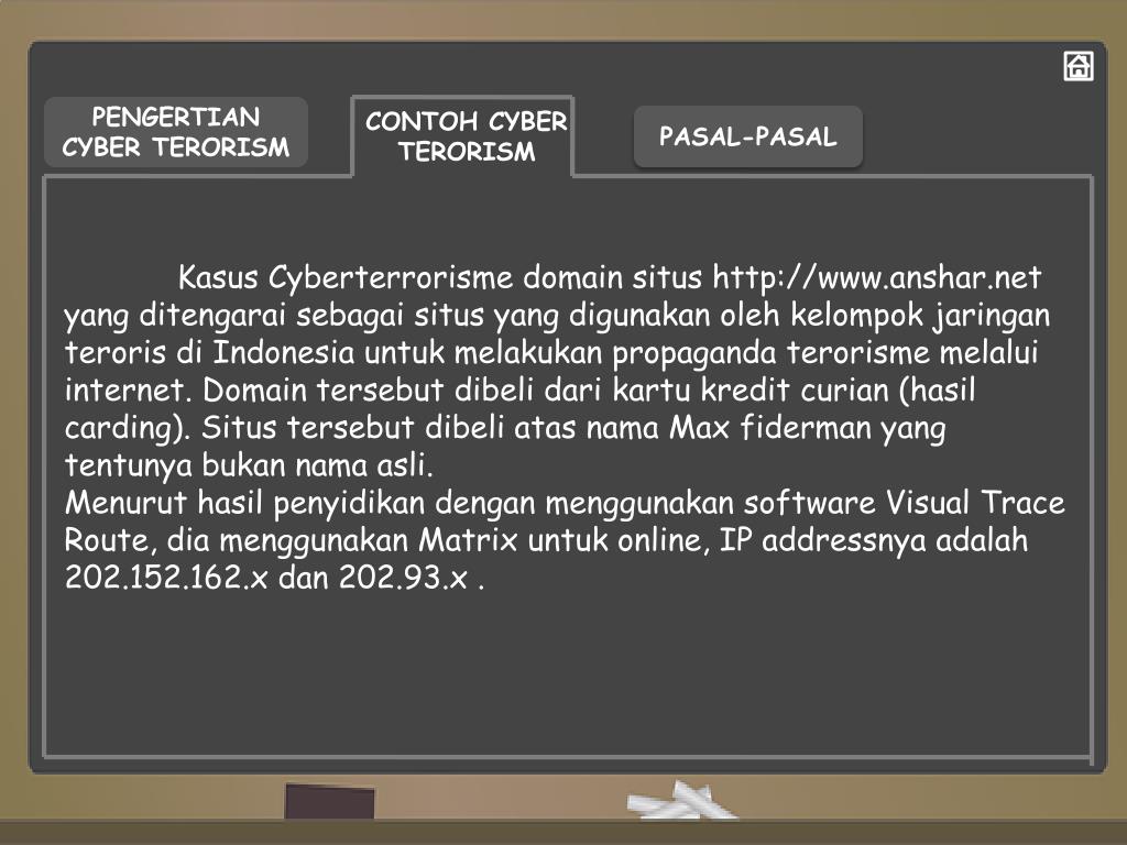 PENGERTIAN CYBER TERORISM CONTOH CYBER TERORISM PASAL-PASAL KasusCyberterrorisme domain situs http://www.anshar.net yang ditengaraisebagaisitus yang digunakanolehkelompokjaringanterorisdi Indonesia untukmelakukan propaganda terorismemelalui internet. Domain tersebutdibelidarikartukreditcurian (hasil carding). Situstersebutdibeliatasnama Max fiderman yang tentunyabukannamaasli.Menuruthasilpenyidikandenganmenggunakan software Visual Trace Route, diamenggunakan Matrix untuk online, IP addressnyaadalah 202.152.162.x dan 202.93.x .