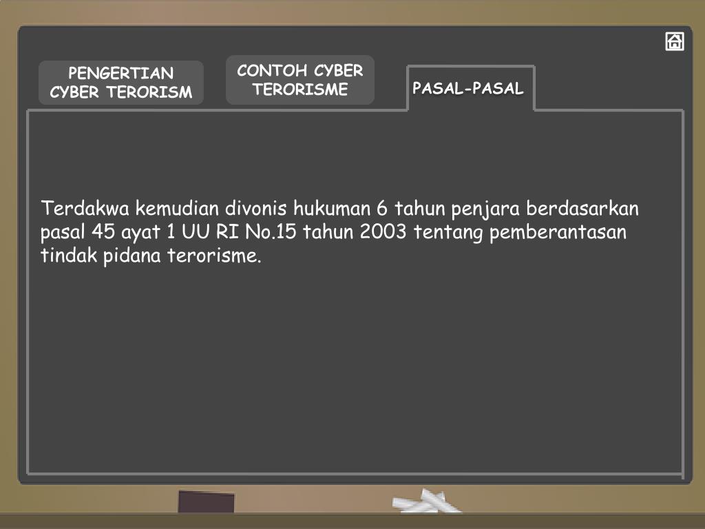 CONTOH CYBER TERORISME PENGERTIAN CYBER TERORISM PASAL-PASAL Terdakwakemudiandivonishukuman 6 tahunpenjaraberdasarkanpasal 45 ayat 1 UU RI No.15 tahun 2003 tentangpemberantasantindakpidanaterorisme.
