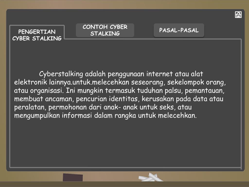 CONTOH CYBER STALKING PASAL-PASAL PENGERTIAN CYBER STALKING Cyberstalkingadalahpenggunaan internet ataualatelektroniklainnya.untuk.melecehkanseseorang, sekelompokorang, atauorganisasi. Inimungkintermasuktuduhanpalsu, pemantauan, membuatancaman, pencurianidentitas, kerusakanpada data atauperalatan, permohonandarianak- anakuntukseks, ataumengumpulkaninformasidalamrangkauntukmelecehkan.