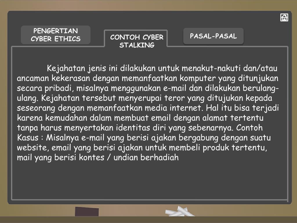 PENGERTIAN CYBER ETHICS PASAL-PASAL CONTOH CYBER STALKING Kejahatanjenisinidilakukanuntukmenakut-nakutidan/atauancamankekerasandenganmemanfaatkankomputer yang ditunjukansecarapribadi, misalnyamenggunakan e-mail dandilakukanberulang-ulang. Kejahatantersebutmenyerupaiteror yang ditujukankepadaseseorangdenganmemanfaatkan media internet. Hal itubisaterjadikarenakemudahandalammembuat email denganalamattertentutanpaharusmenyertakanidentitasdiri yang sebenarnya. ContohKasus : Misalnya e-mail yang berisiajakanbergabungdengansuatu website, email yang berisiajakanuntukmembeliproduktertentu, mail yang berisikontes / undianberhadiah
